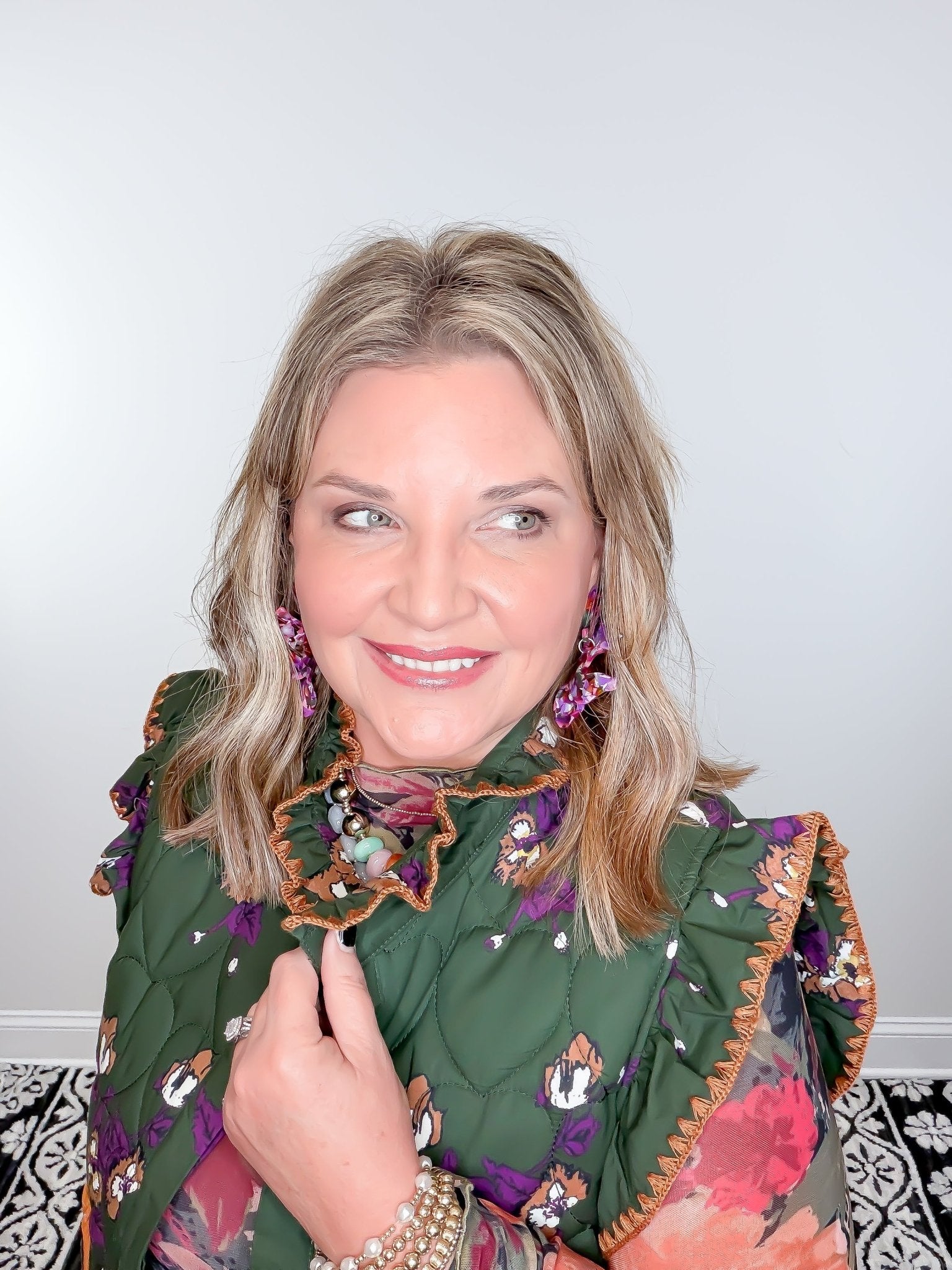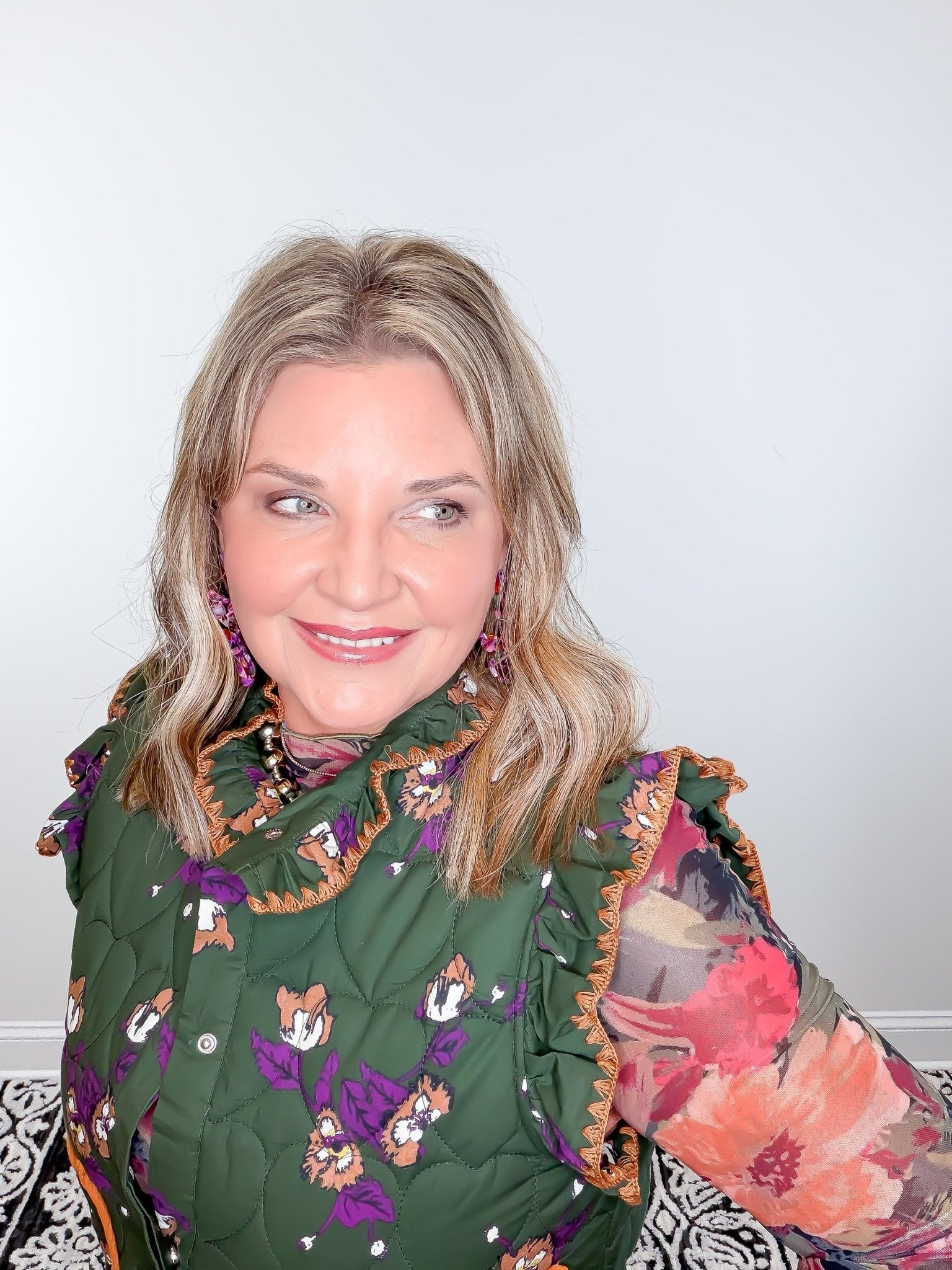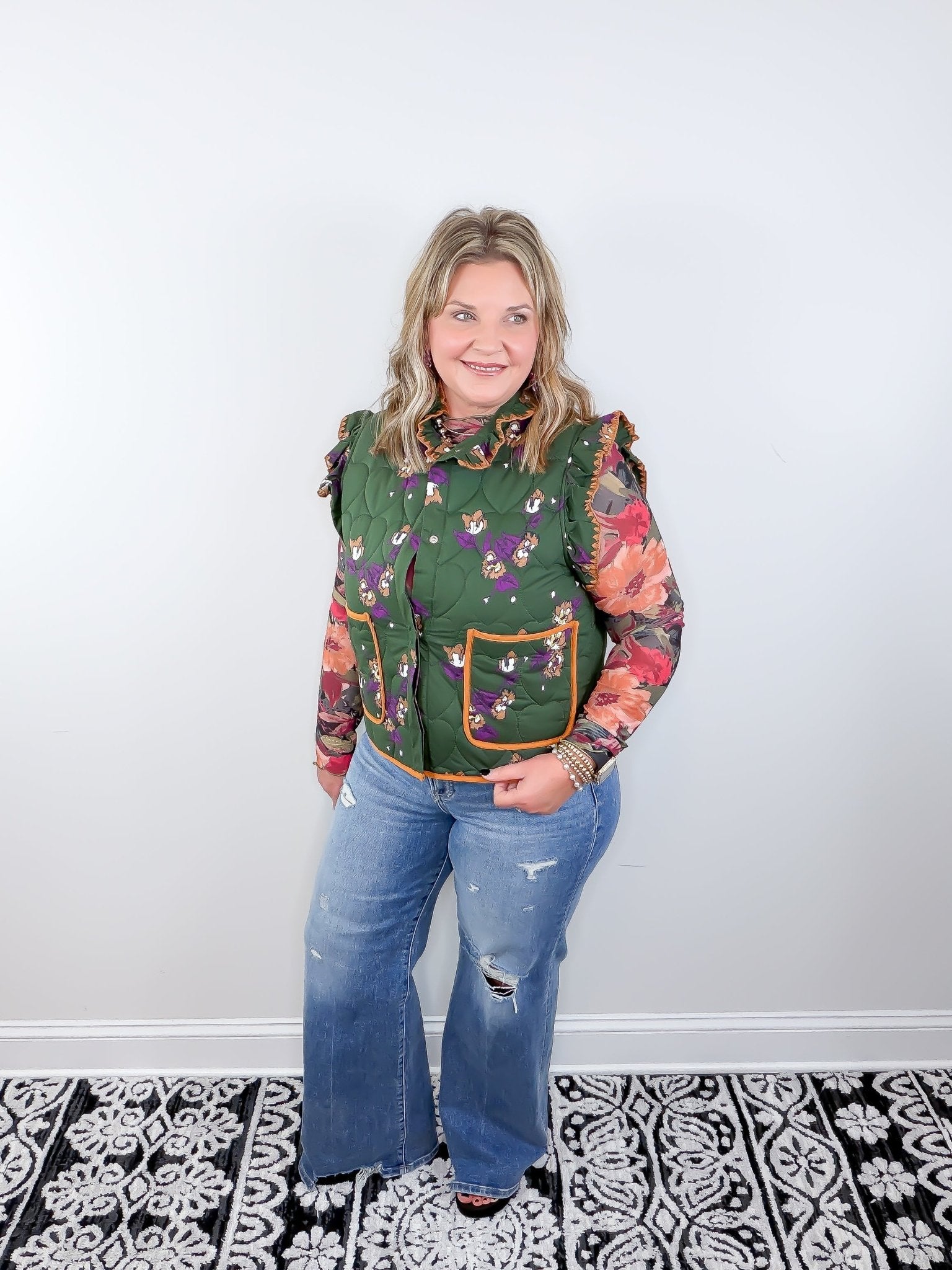 Wrap yourself in charm with the Quilted in Love Vest, featuring adorable heart-patterned stitching and flirty ruffle trims on the shoulders and collar. This sleeveless vest snaps shut easily and offers handy pockets for your essentials. Perfect for layering fun and warmth with a playful touch.