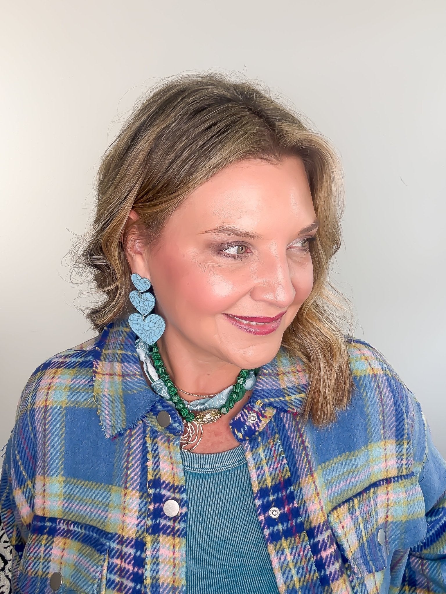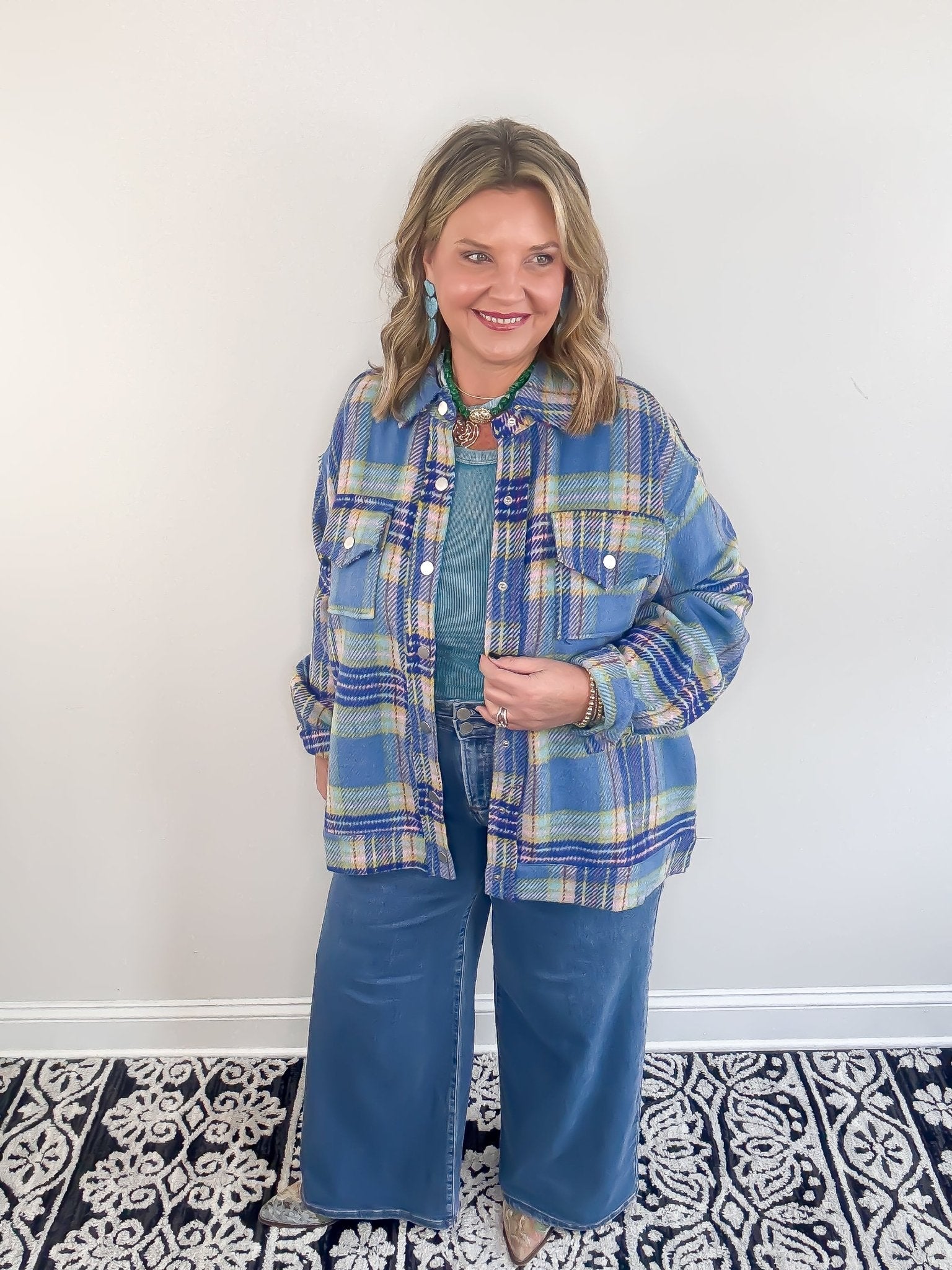 Bring a classic vibe to your wardrobe with this charming plaid shacket, boasting a relaxed, slouchy fit. It features snap buttons down the front alongside handy side and chest pockets with trendy raw-edge accents. Perfect for layering, this playful piece is your new go-to for chilly days and stylish fall looks.