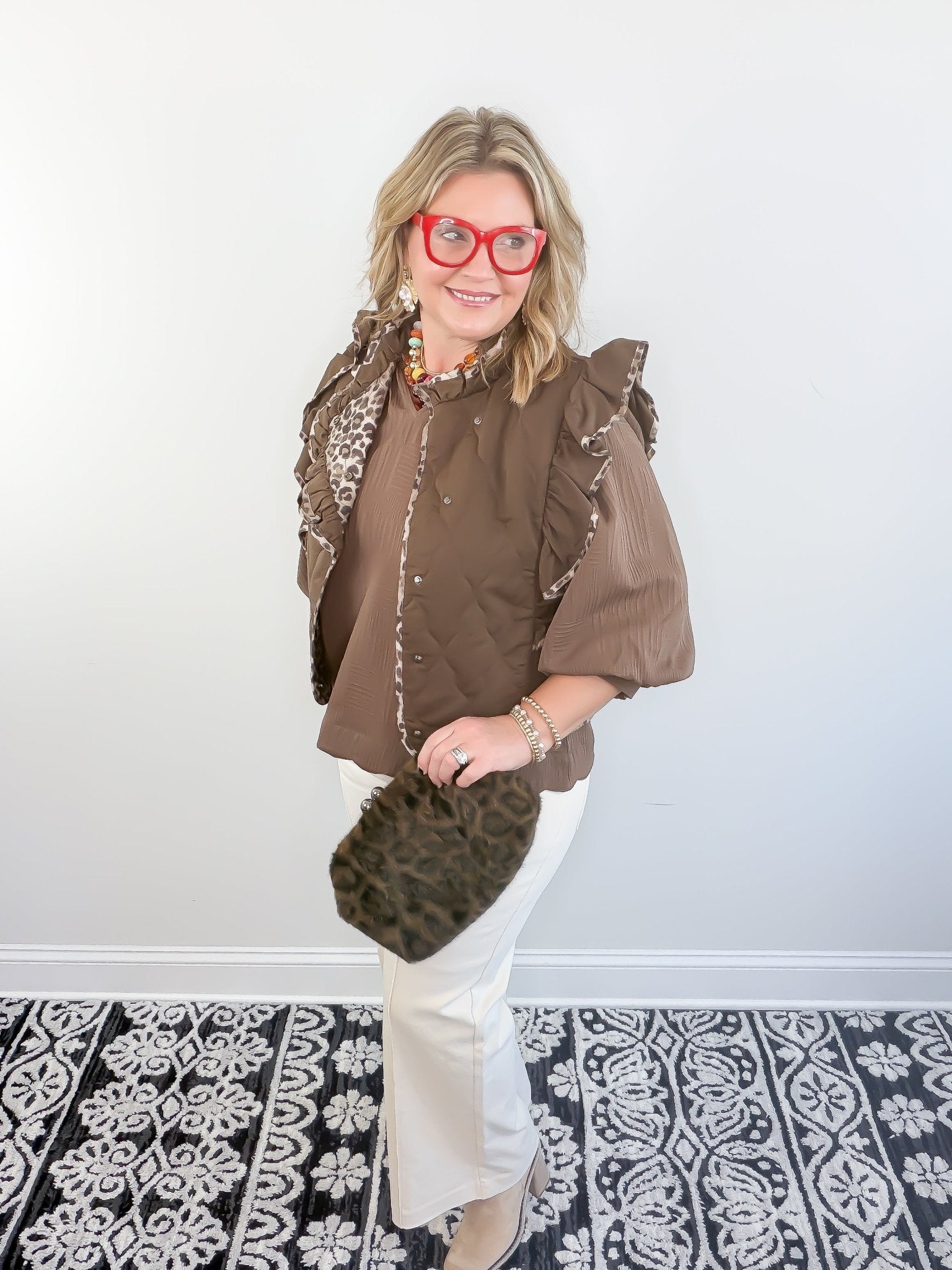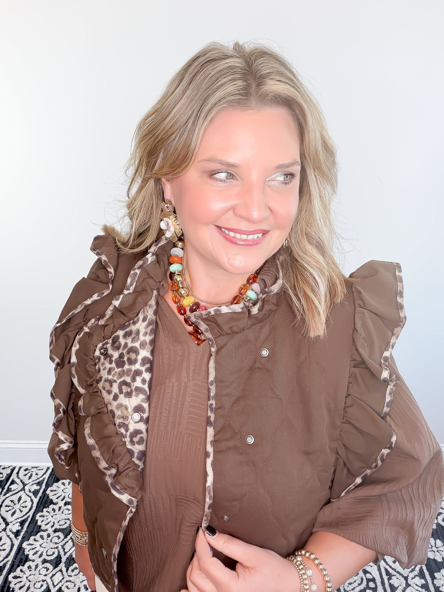 Add a wild twist to your layering with The Untamed Quilted Vest! Featuring a snap button front and a cozy high collar, this sleeveless vest boasts playful ruffle shoulders and striking leopard trim for a fun, fierce look. With handy side slip pockets and a soft lined interior, it’s the perfect mix of style and comfort to elevate any outfit. Embrace your untamed side while staying warm and chic!