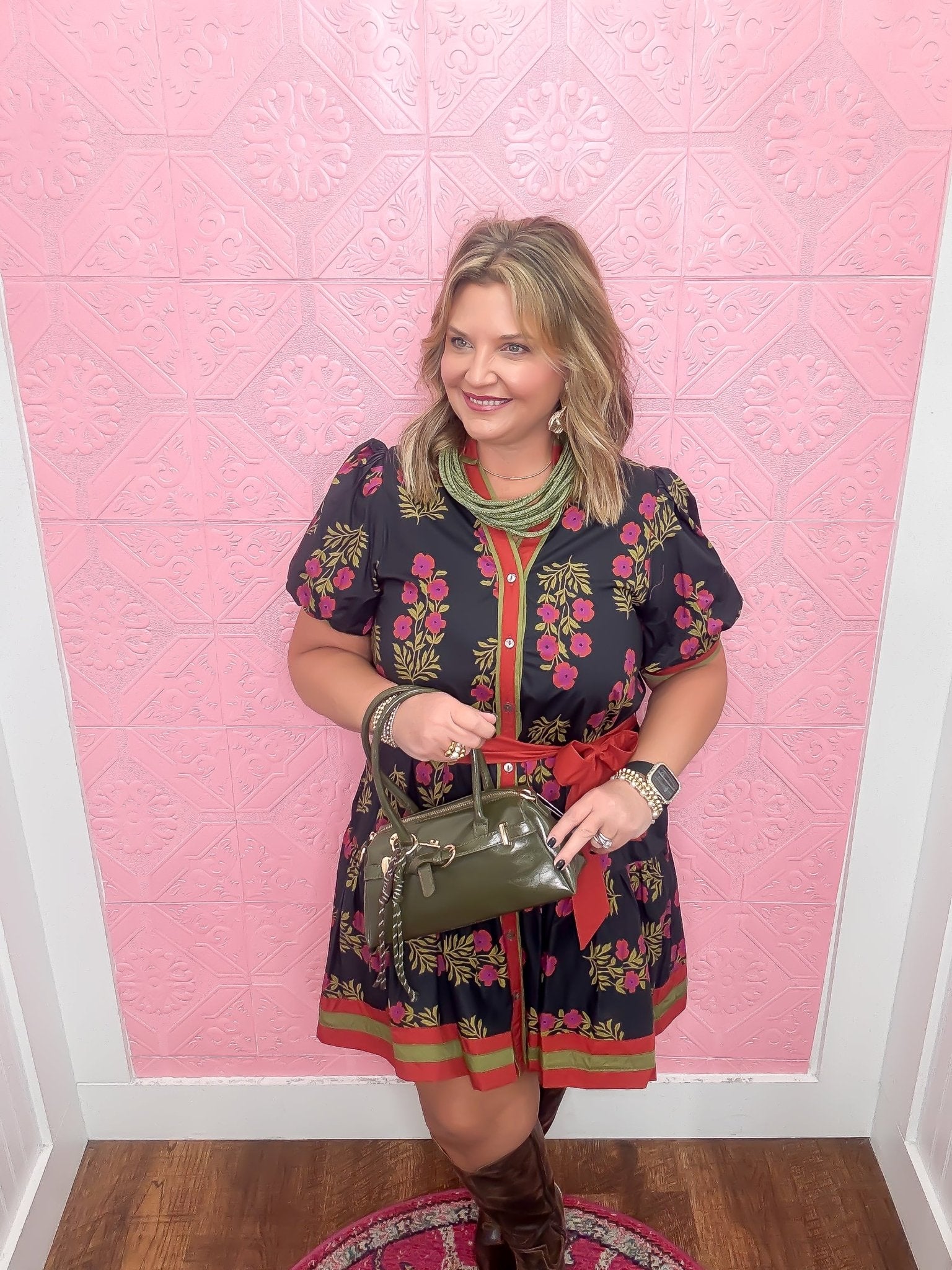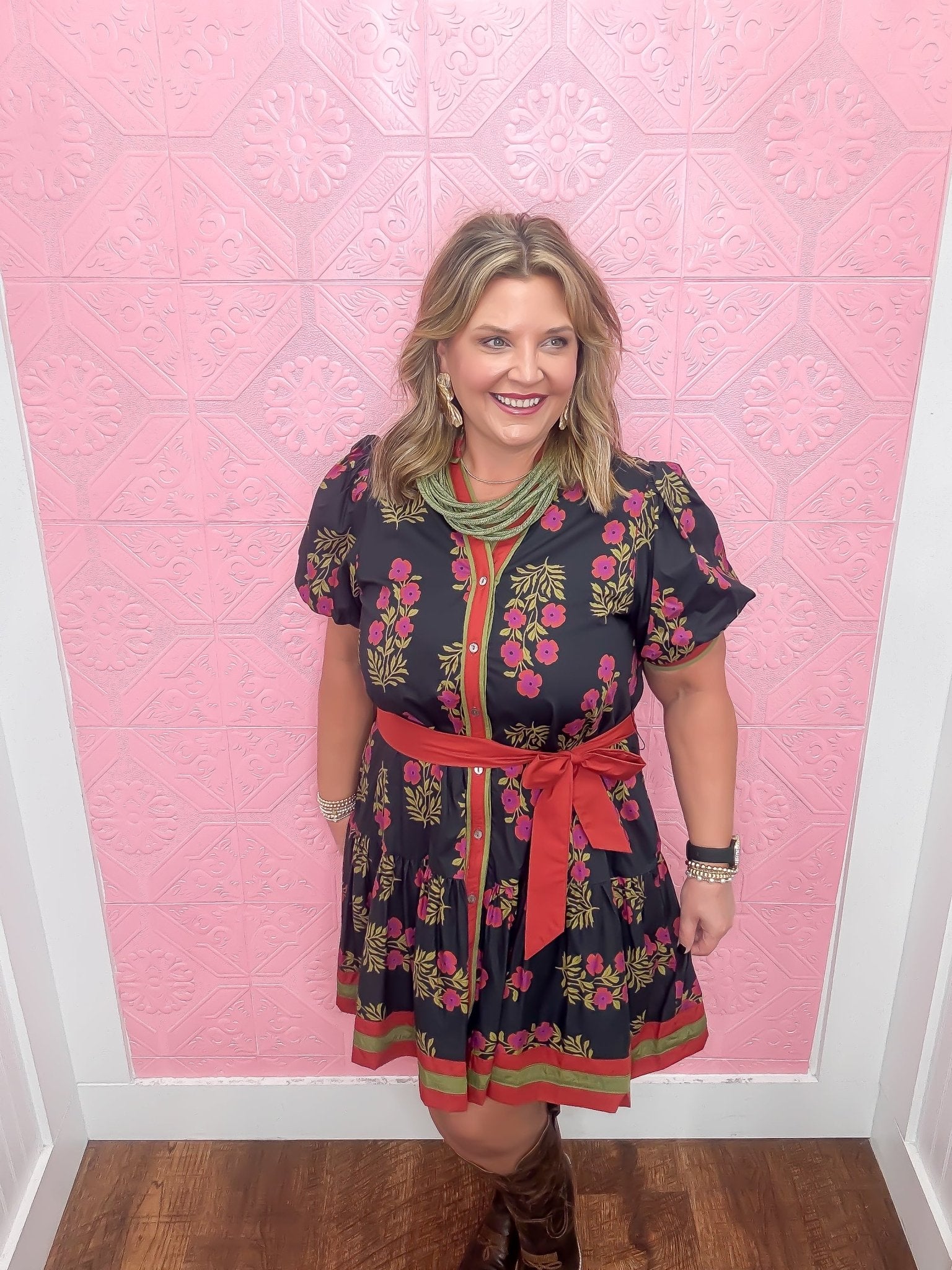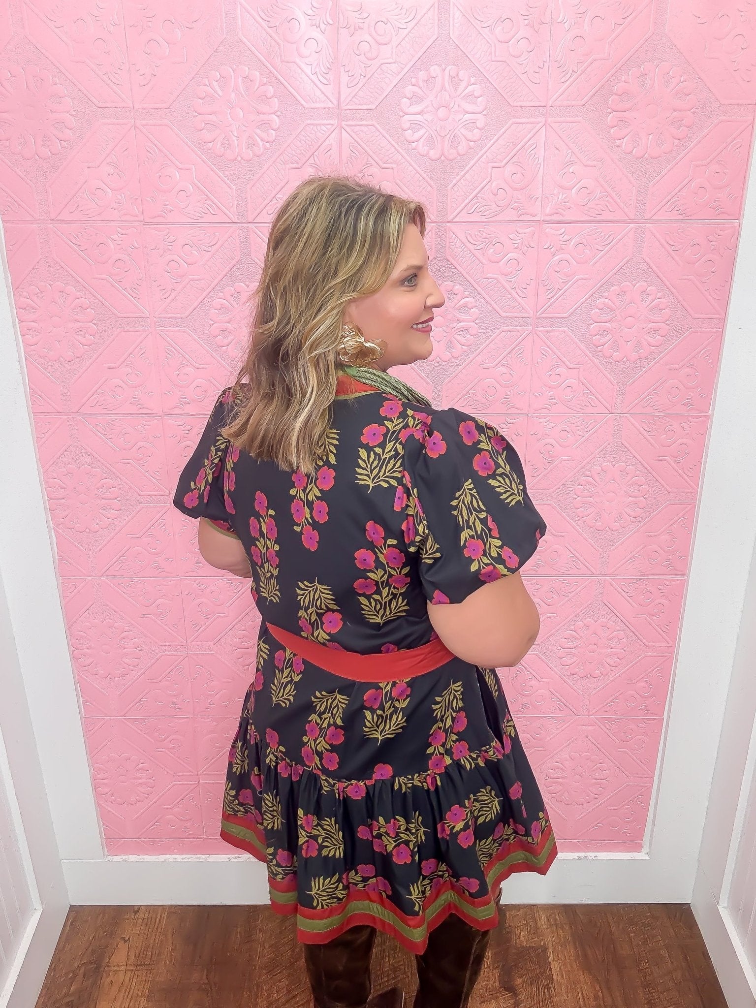 Step into the spotlight with the Wildflower After Dark Mini Dress! This playful piece features charming short puff sleeves and a flirty ruffle hem, all accented by a vibrant multicolor band. The V-neck with a band collar and button closure adds a touch of chic, while the removable belt lets you tailor your look. Lightweight and lined for comfort, this woven dress also surprises with handy side pockets—perfect for keeping essentials close during your fun-filled nights. Embrace effortless style that dances with you wherever you go!