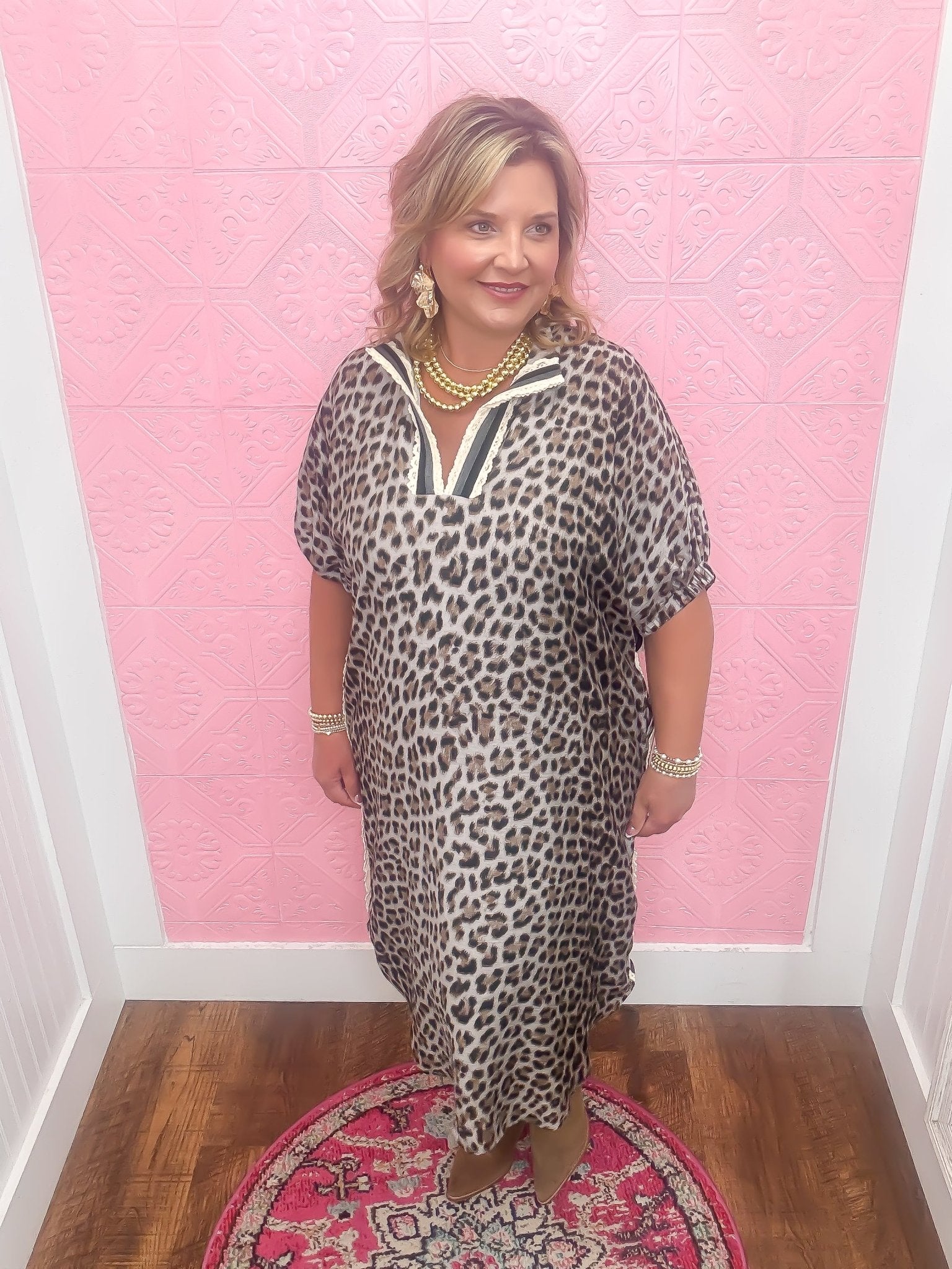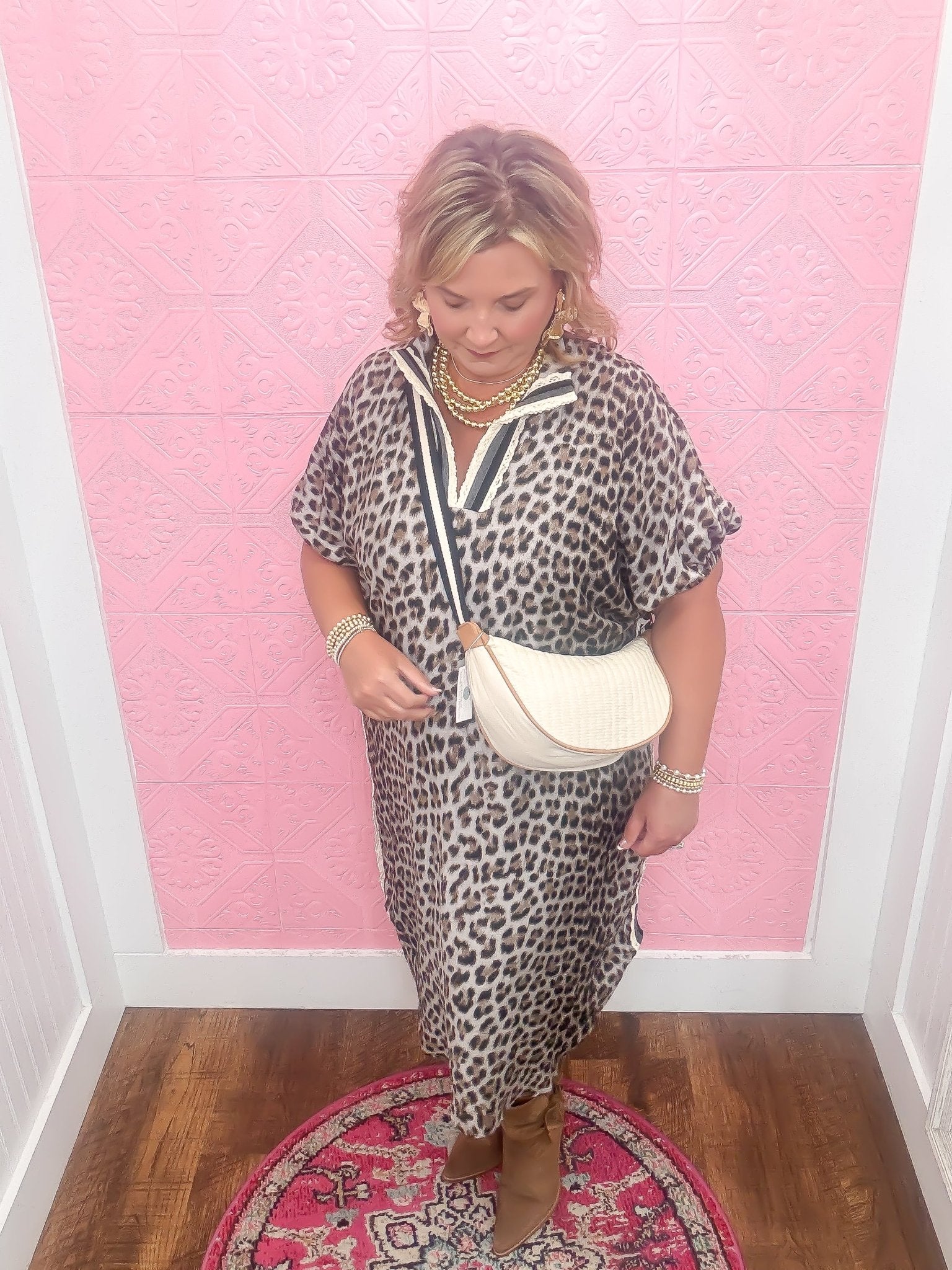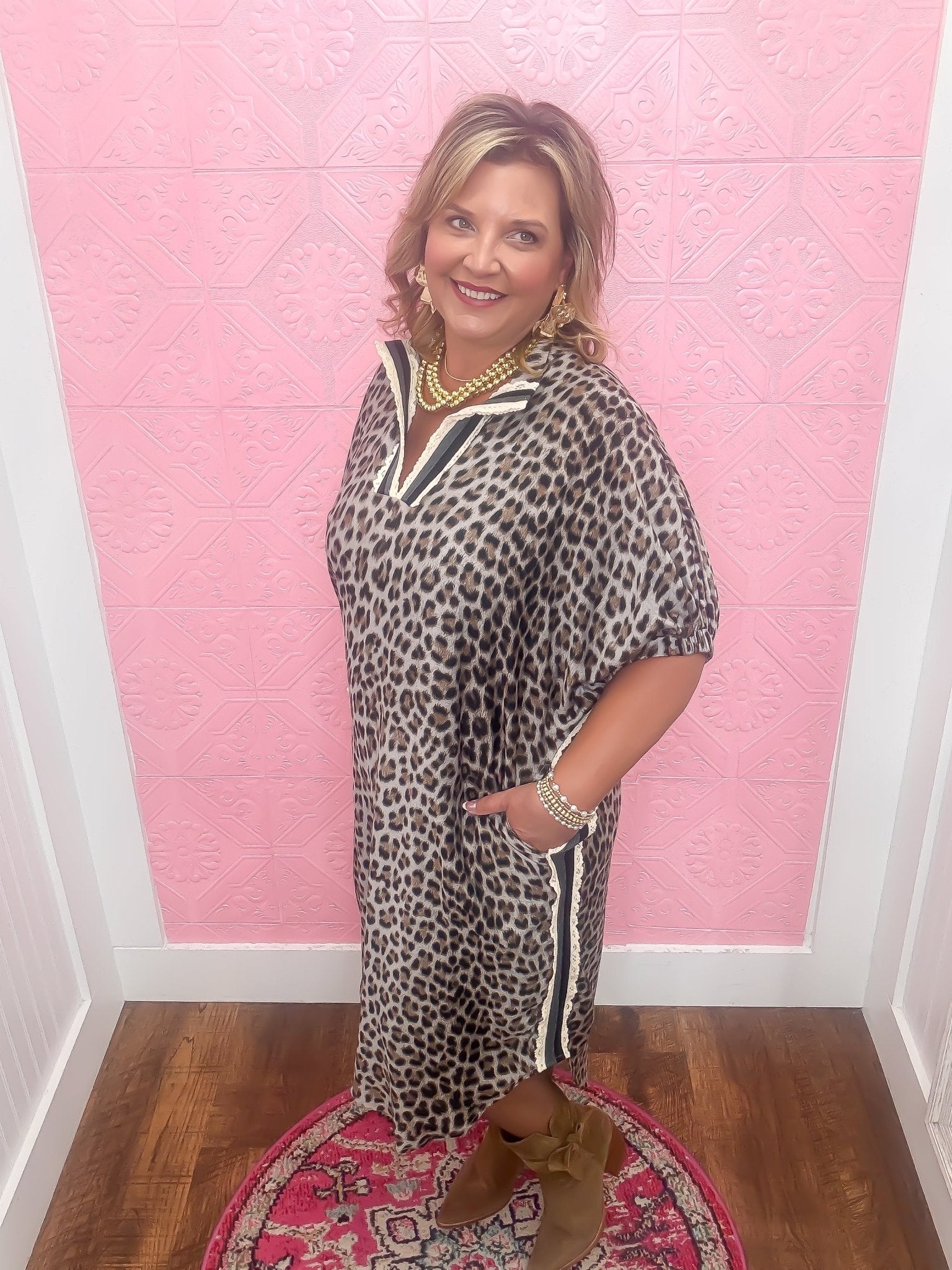 Embrace your wild side with the Softly Savage Midi Dress! This playful leopard print dress features breezy ¾ dolman sleeves and a colorful lace-edged ribbed neckline that adds a fun pop of detail. Lightweight and fully lined, it offers comfort without being sheer. Plus, handy side pockets make it as practical as it is stylish. Perfect for turning heads wherever you go!