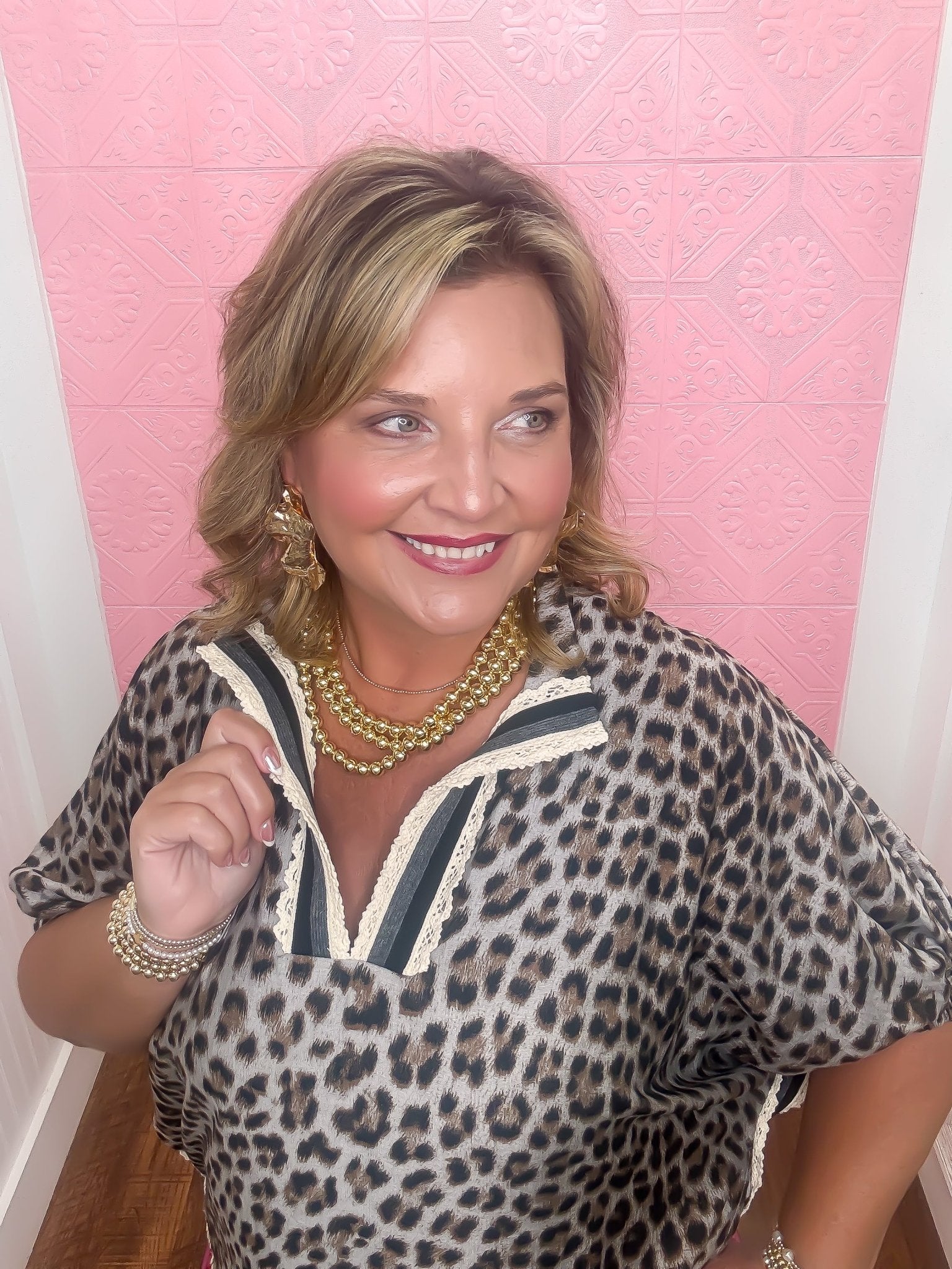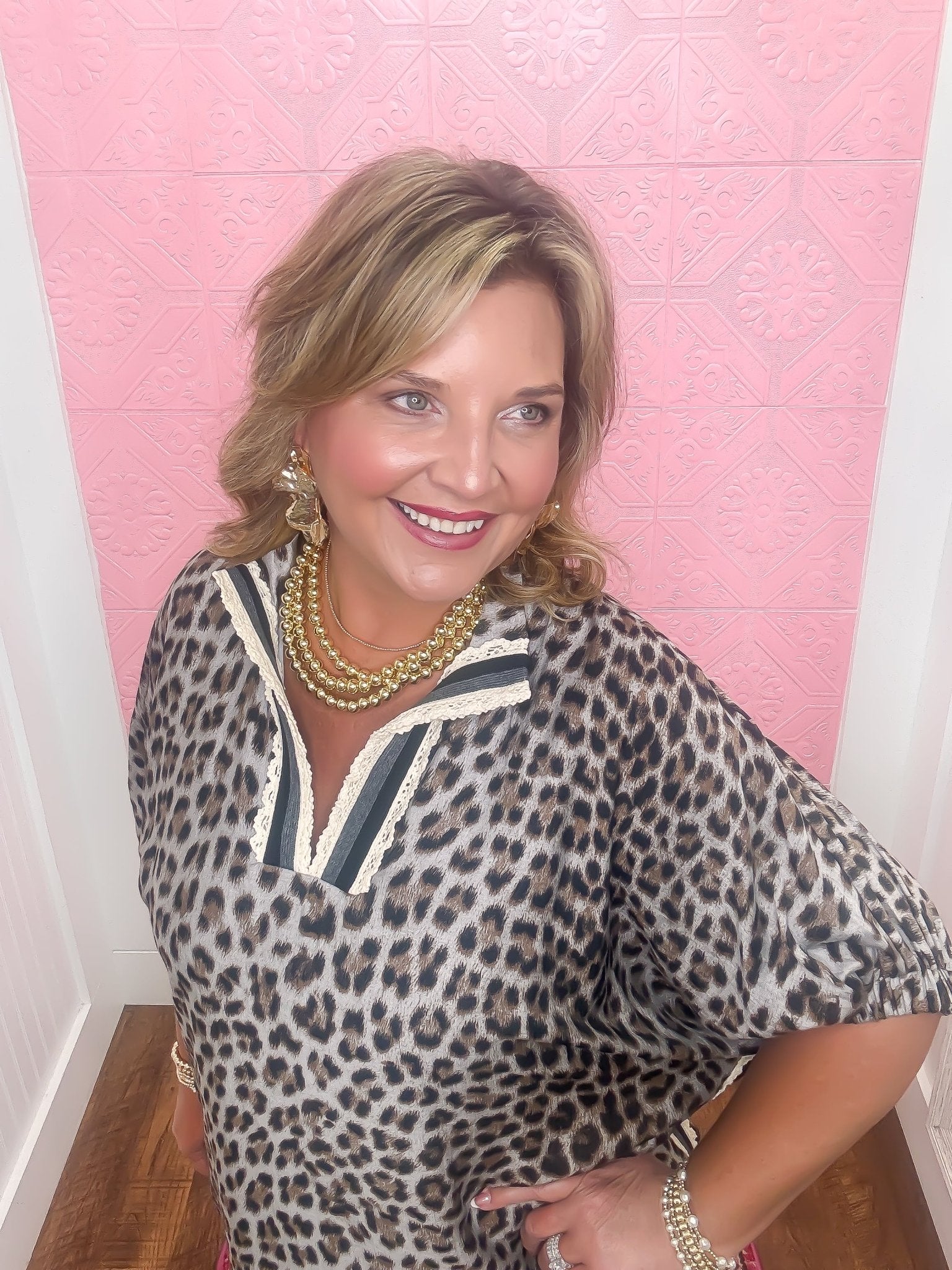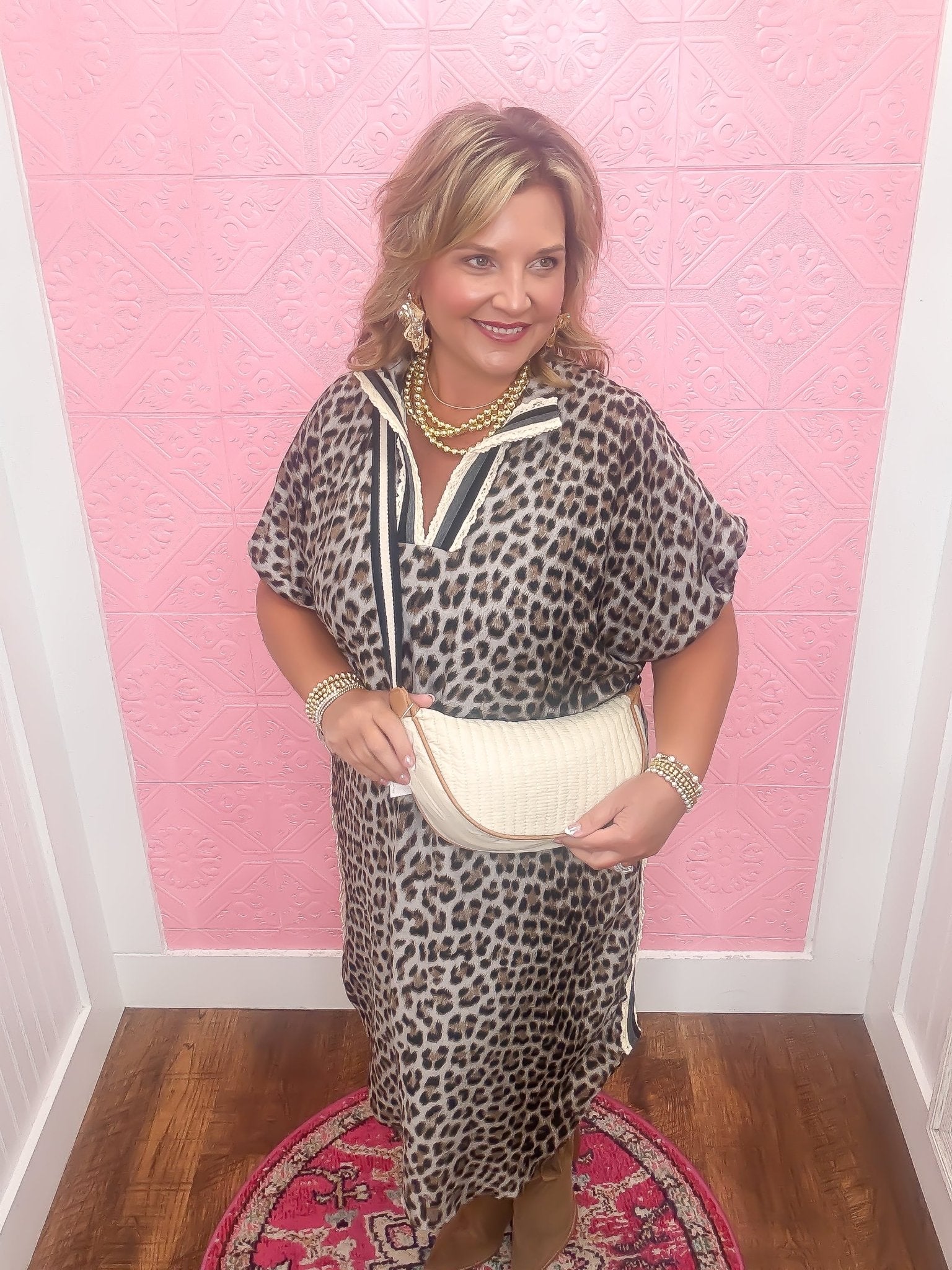 Embrace your wild side with the Softly Savage Midi Dress! This playful leopard print dress features breezy ¾ dolman sleeves and a colorful lace-edged ribbed neckline that adds a fun pop of detail. Lightweight and fully lined, it offers comfort without being sheer. Plus, handy side pockets make it as practical as it is stylish. Perfect for turning heads wherever you go!