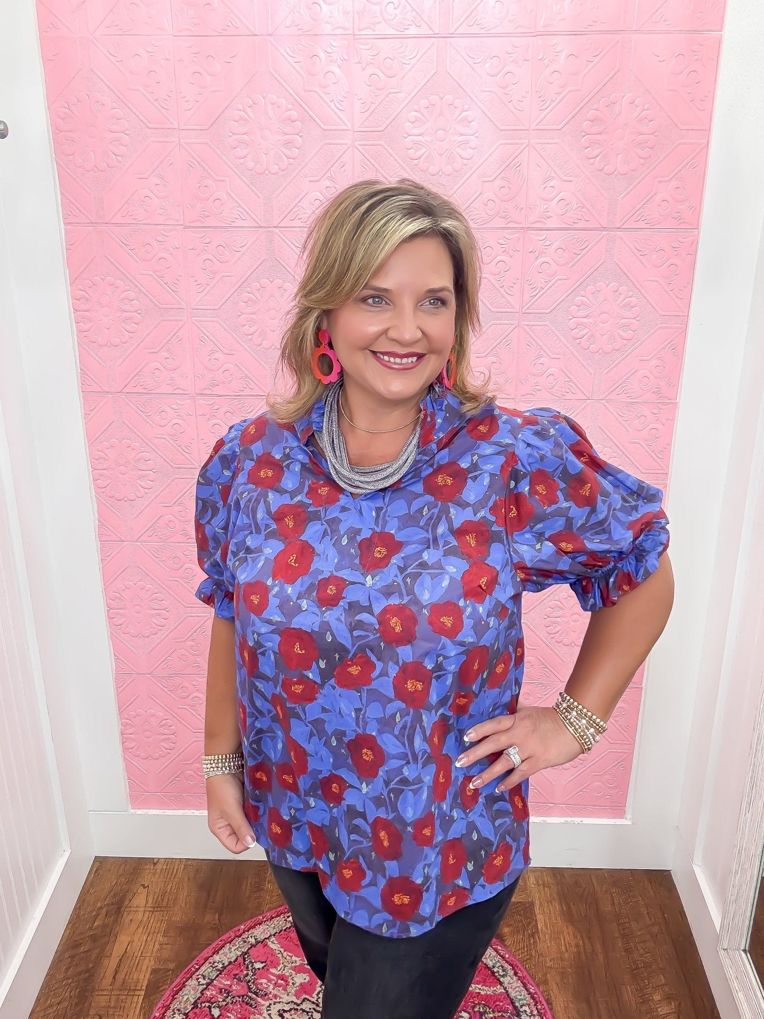 The Belle After Dark Blouse brings a playful charm with its floral pattern and short puff sleeves. Its pleated ruffle V-neck band collar adds a flirty touch, while the lightweight woven fabric keeps you comfortable all day. Unlined and non-sheer, this pullover top is perfect for breezy days and effortless style.