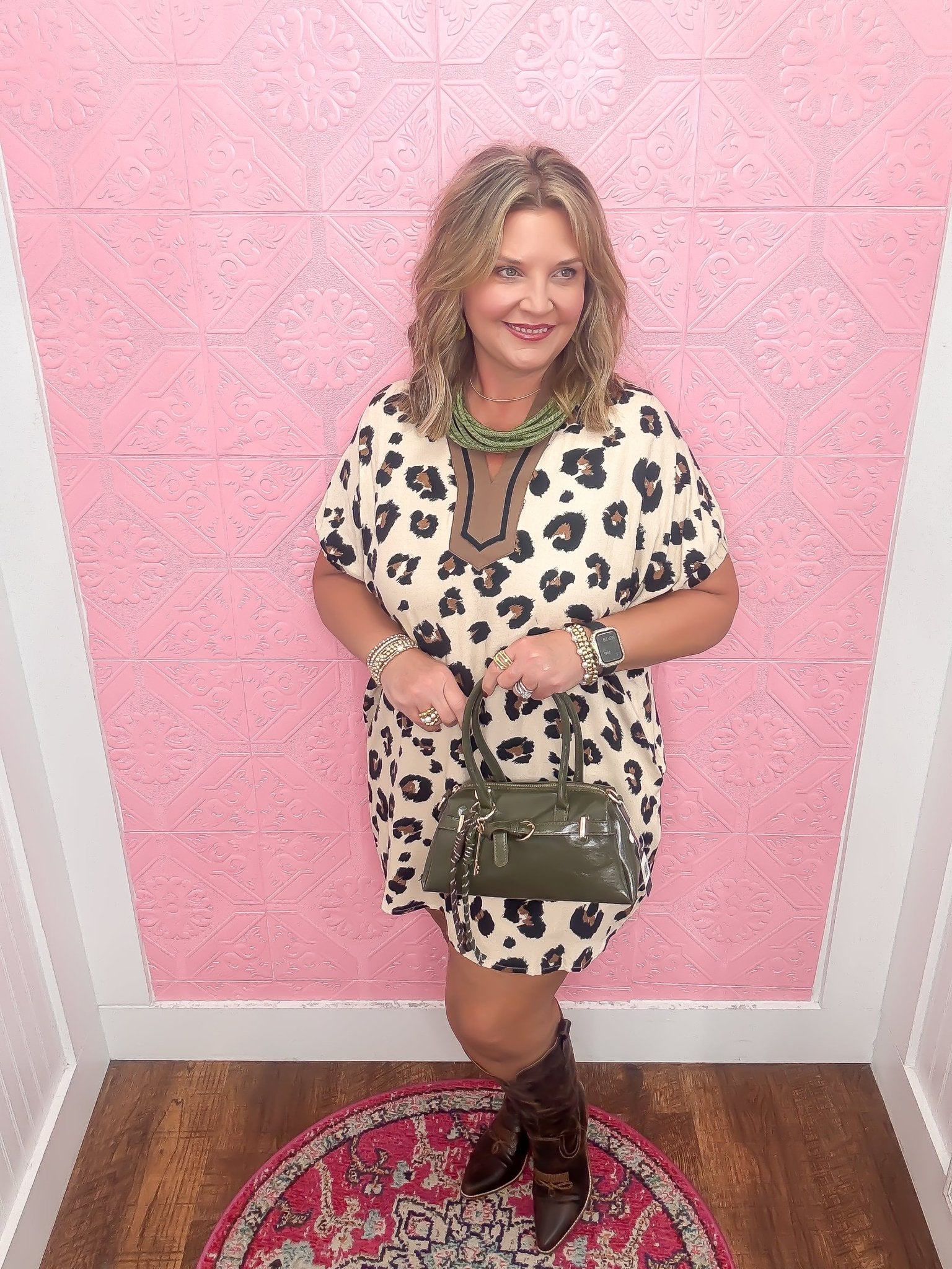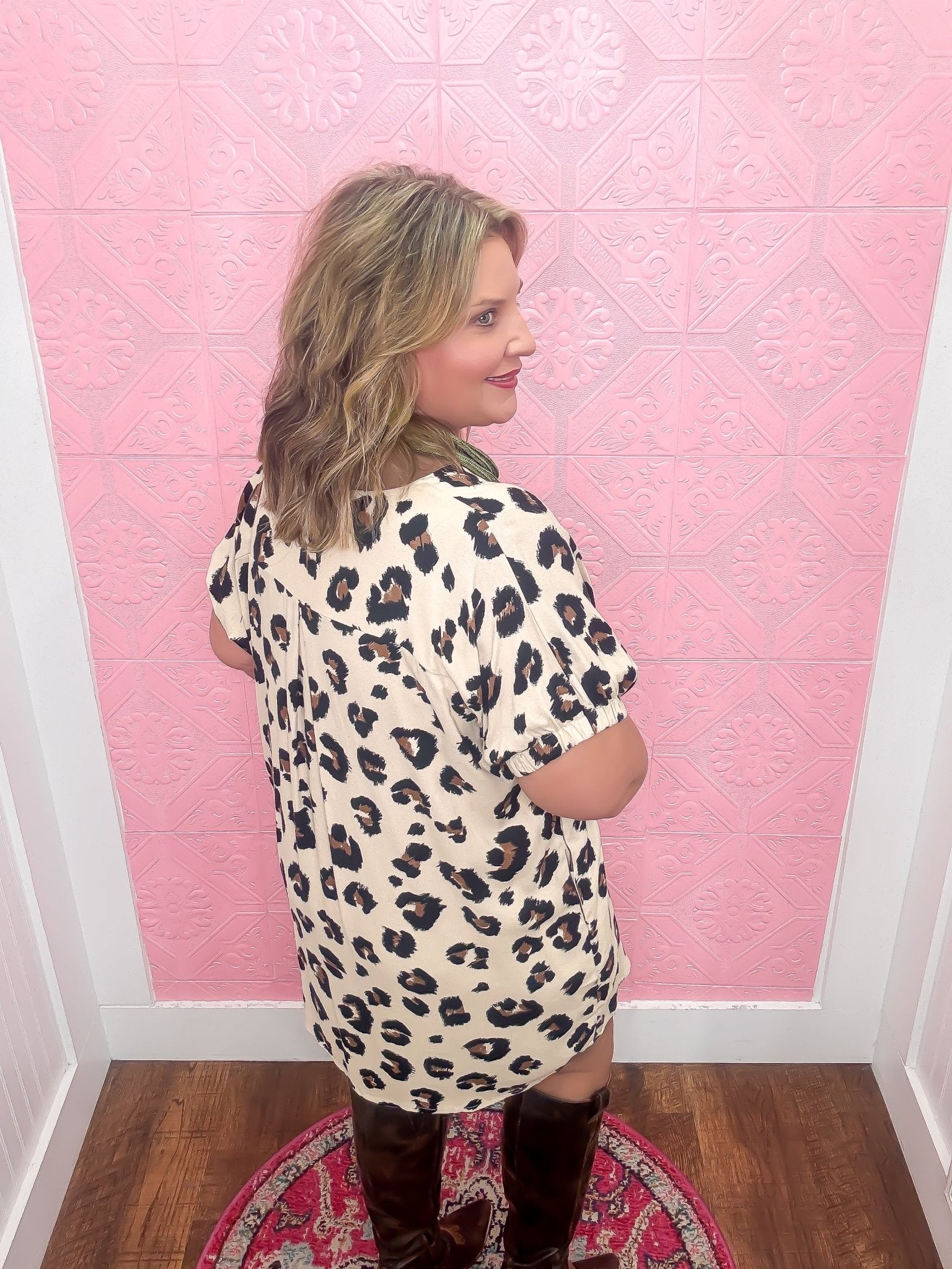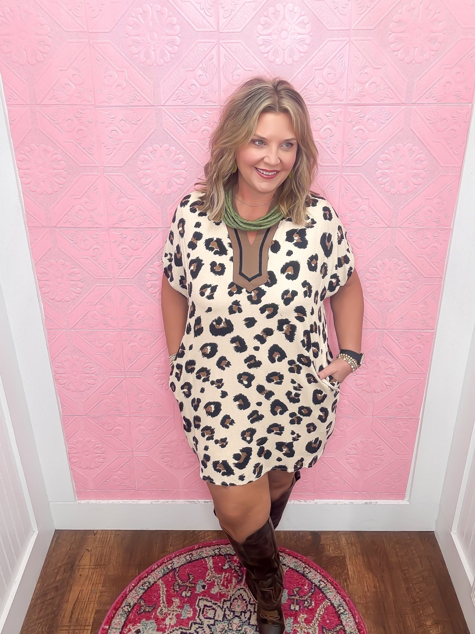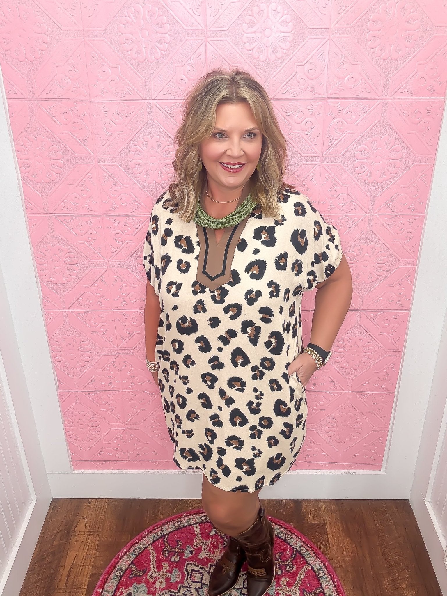 Turn heads in the Lowcountry Leopard Mini Dress, where bold meets breezy. This oversized, elasticated dolman sleeve dress offers a playful silhouette, while the contrast inset binding around the neck adds a chic twist. Fully lined and woven from lightweight fabric, it’s comfortable and non-sheer—perfect for dancing through the day or night with effortless style.