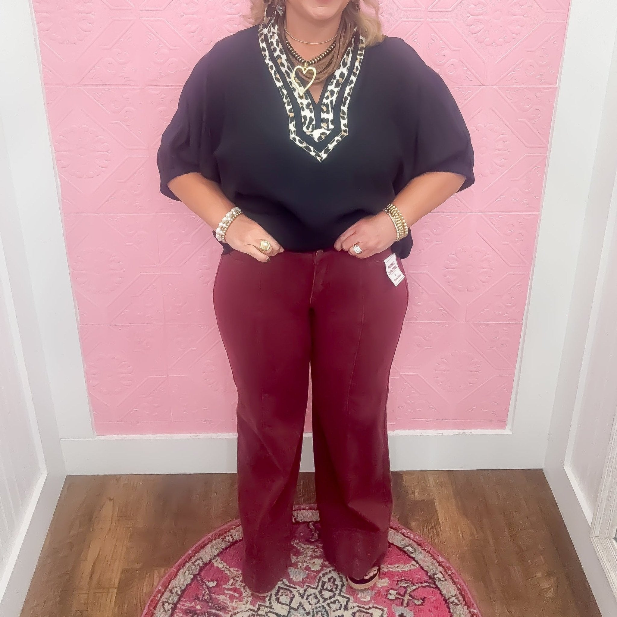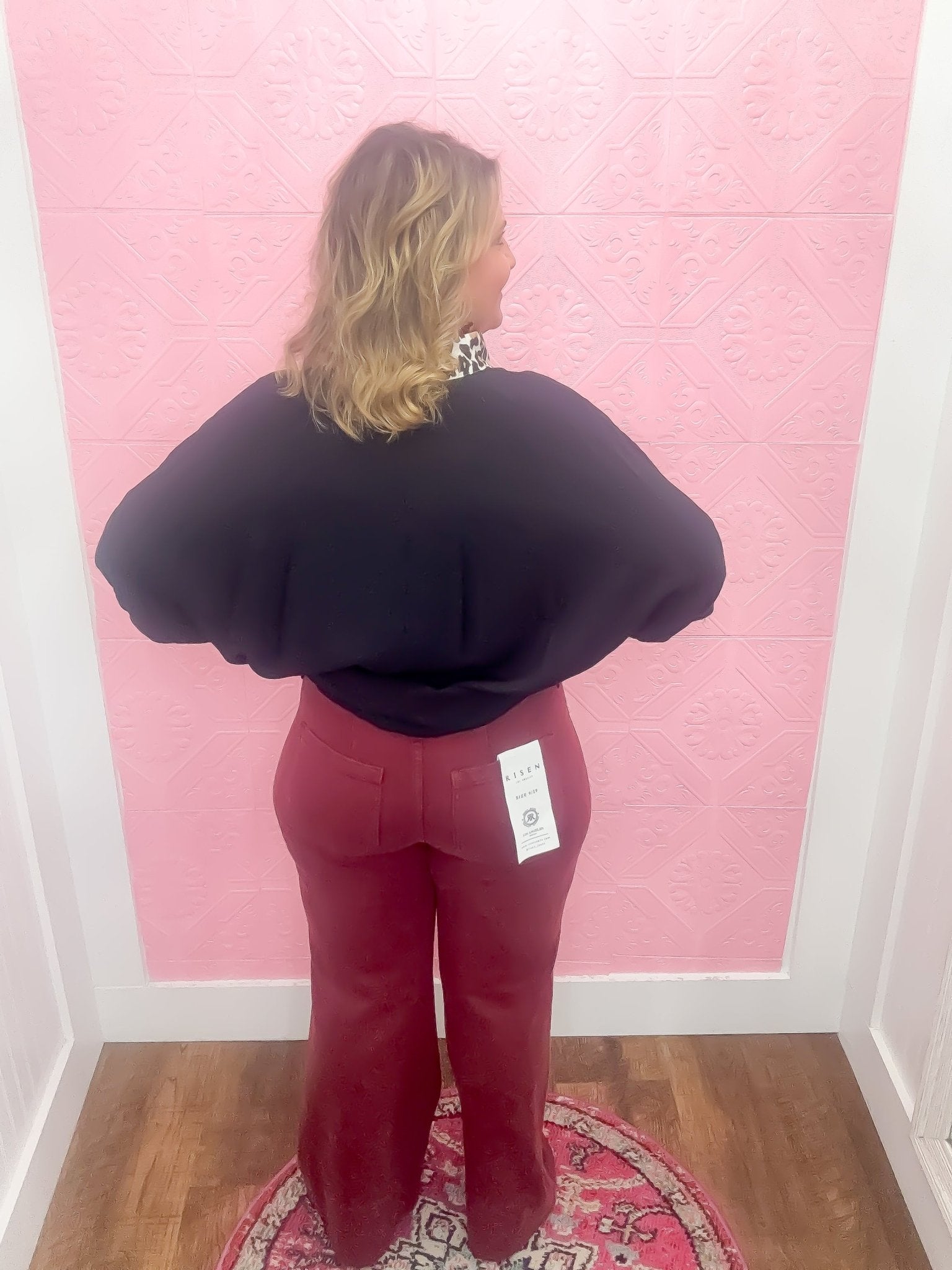 Turn heads and feel fabulous in the RISEN | Wine About It Wide Leg Jeans. Featuring tummy control and a flattering mid-rise fit, these wine-colored pants balance comfort with style. The wide leg and wide hem create a flowy silhouette that moves with you, perfect for everything from brunch to dance-offs. Embrace confidence with designs that hug your curves in just the right places!