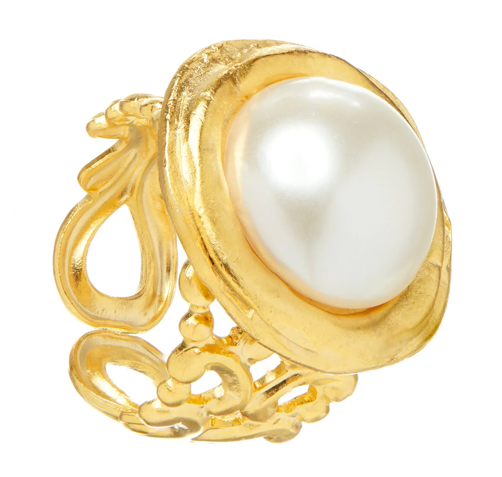 Experience the elegance of Susan Shaw's Handcast Gold Pearl Adjustable Ring. This distinctive ring features a face measuring 0.75" W x 0.875" L, set on a size 8 adjustable band. Inspired by Northern European styling, this piece is a testament to our three-decade legacy of creating unique, high-quality jewelry. Experience Susan Shaw, where every piece tells a story.