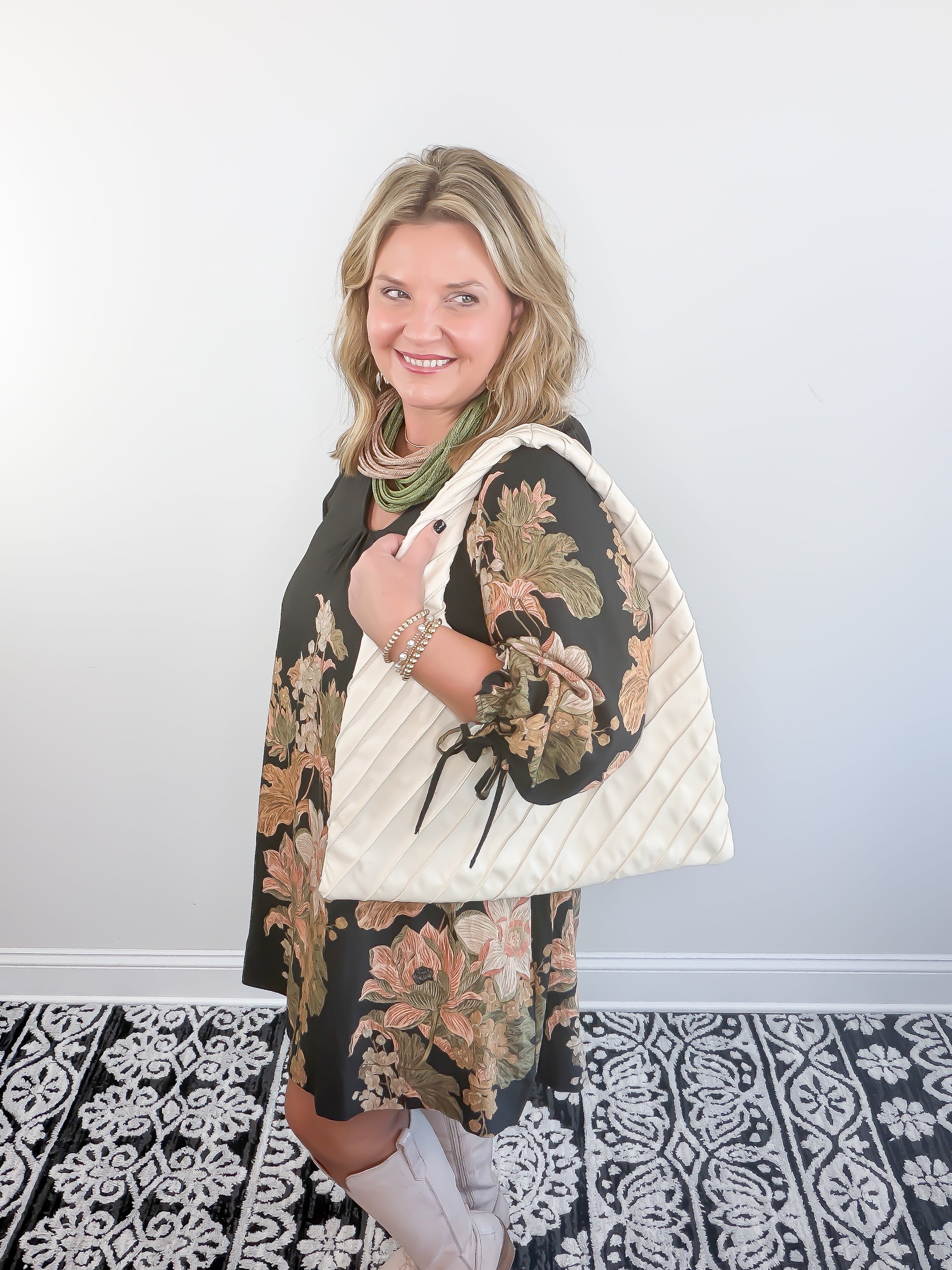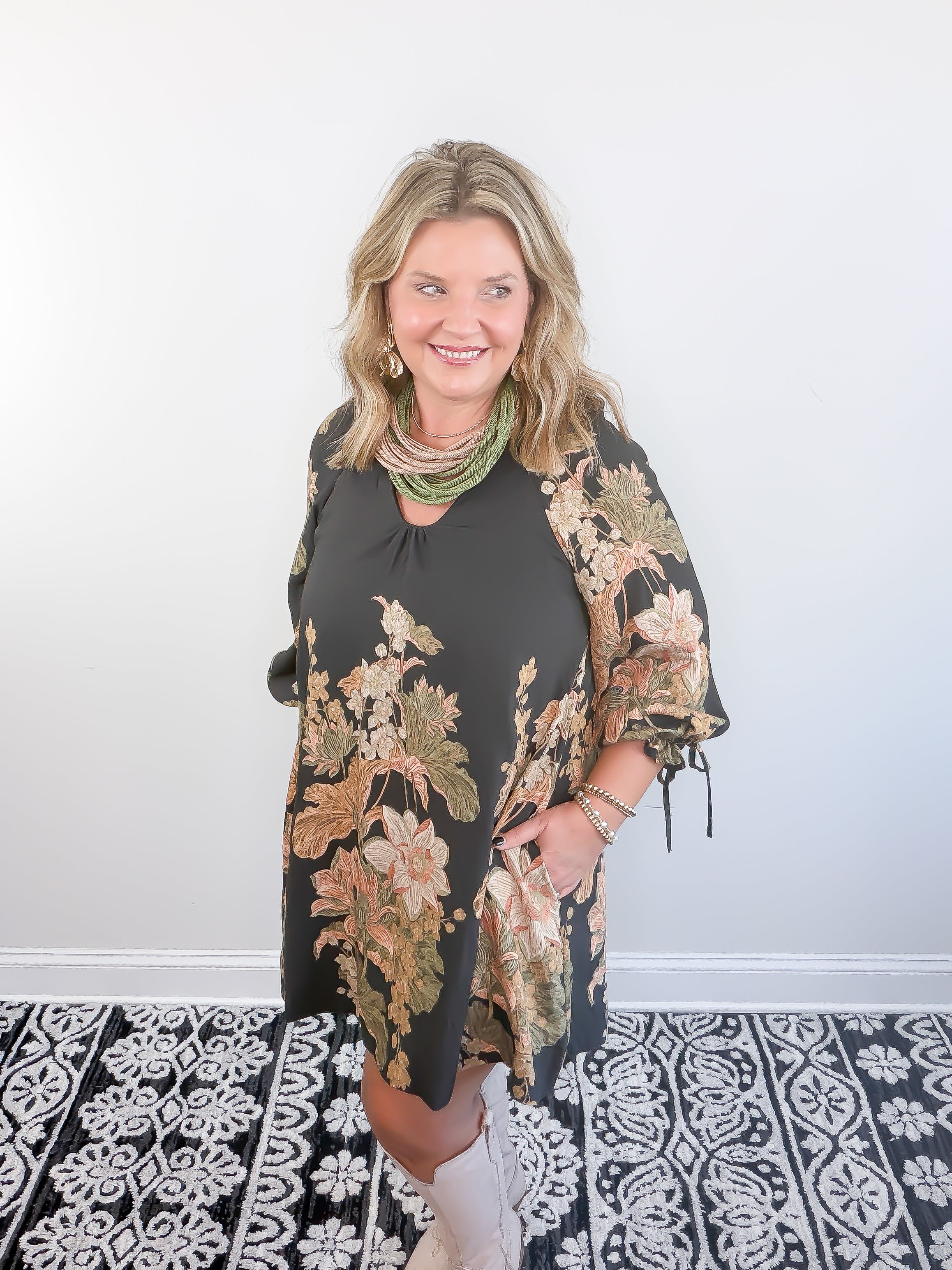 Step into a garden of style with The Elegant Garden Mini Dress! This playful floral print dress features a flattering V-neck with charming gathered details and cozy side pockets for your essentials. Lightweight and fully lined, it’s woven for comfort without any sheerness. The long sleeves with tie closures at the cuffs add a fun, flirty touch to your look—perfect for twirling through any day or night adventure.