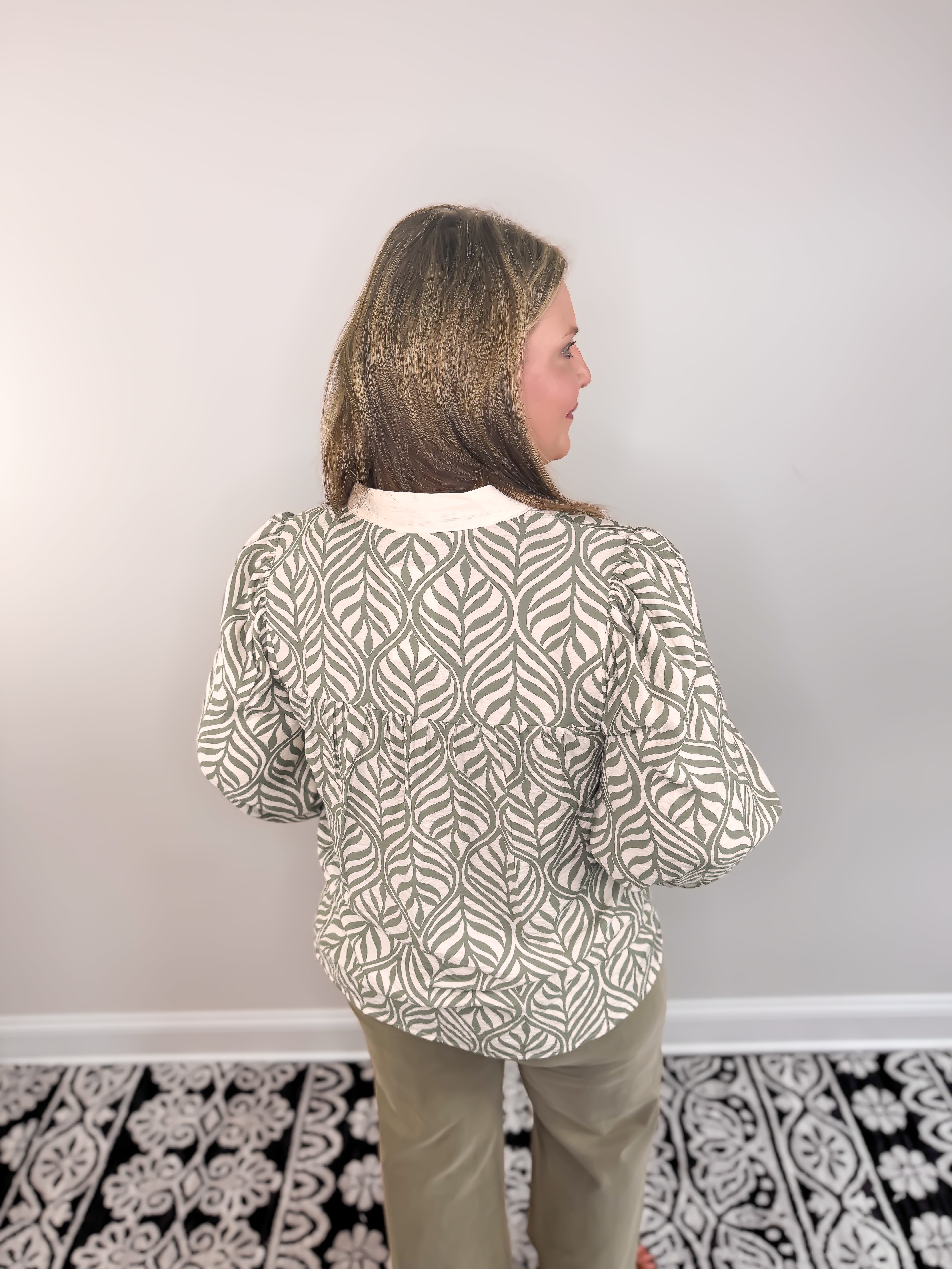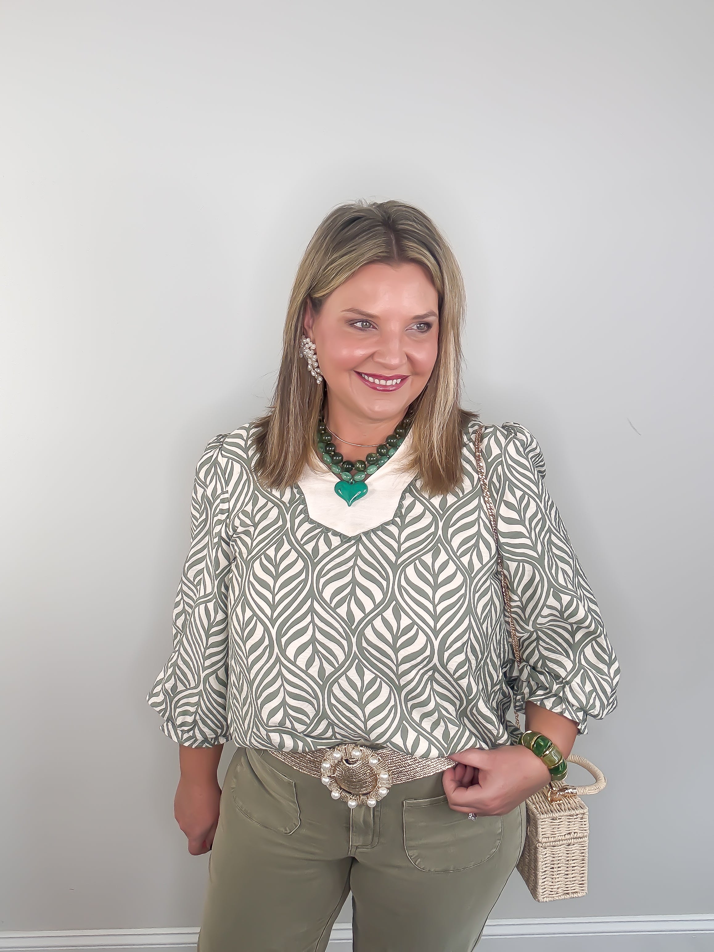 Embrace effortless charm with The Boho Leafline Blouse. Featuring breezy 3/4 sleeves and a trendy standing collar, this top pairs playful leaf prints with solid contrast and delicate lace trim for a touch of whimsy. Perfect for adding a spirited vibe to your everyday style.