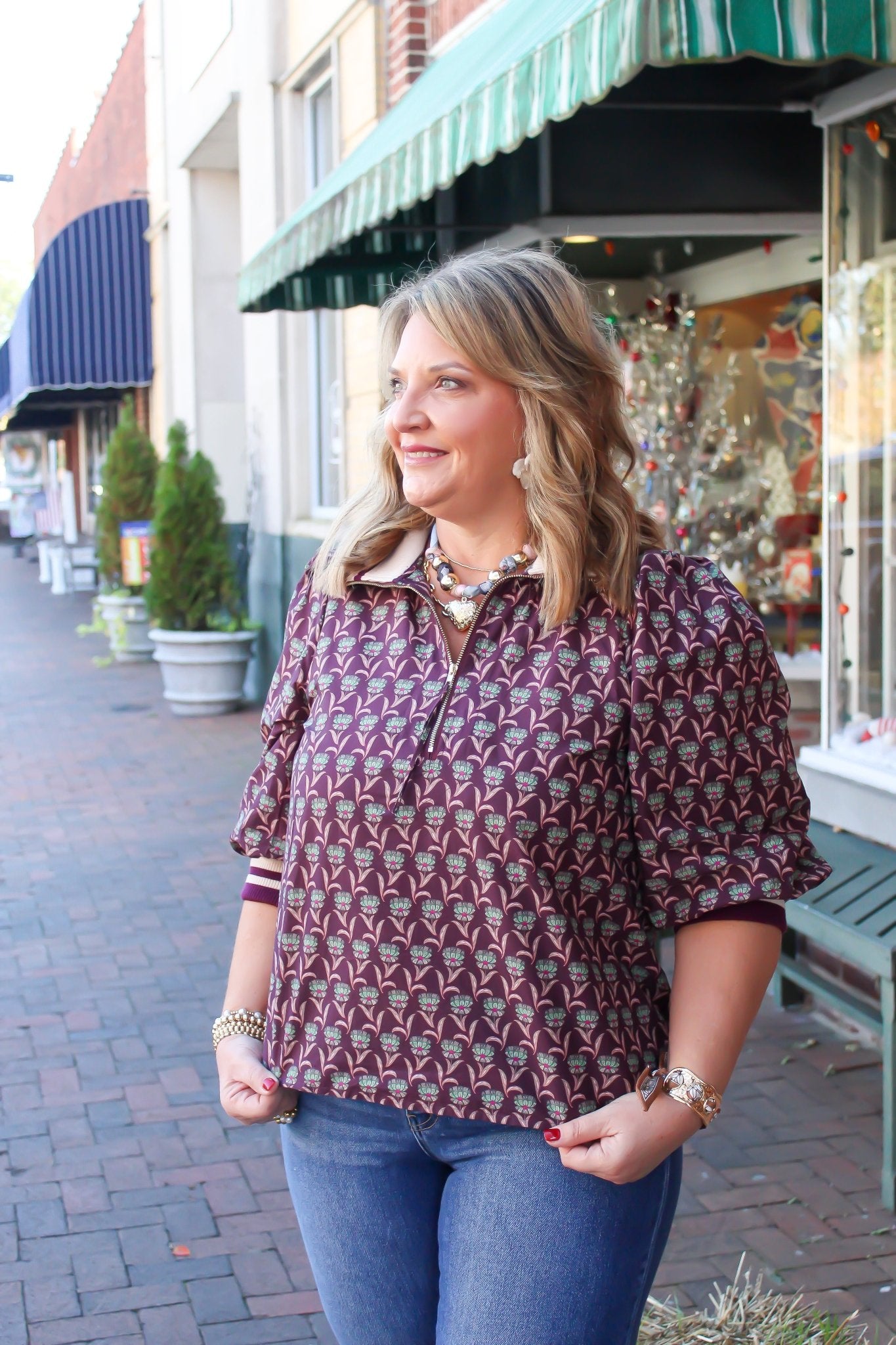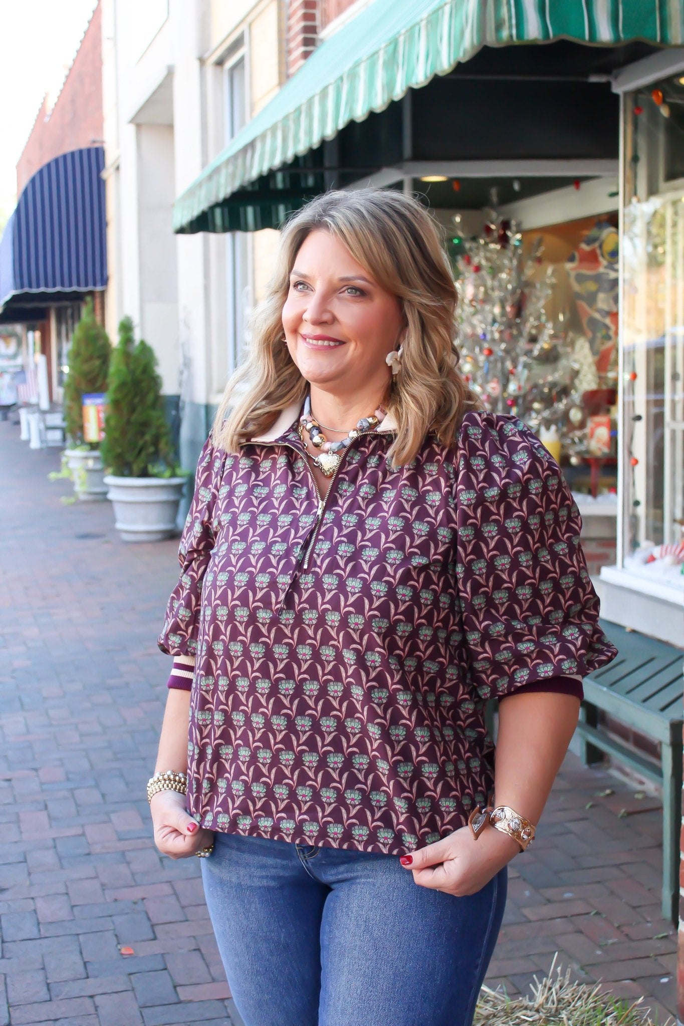 The Bloomline Blouse brings a fresh twist to your wardrobe with its cheerful floral print and playful 3/4 puff sleeves. Featuring a half zip front and a sporty contrast stripe ribbed collar and cuffs, this lightweight woven top is unlined and breezy—perfect for layering or shining solo on sunny days. Add a pop of fun and effortless charm to your look!