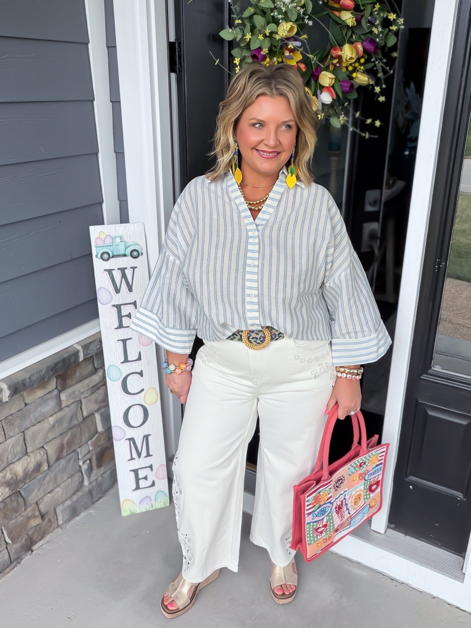 Elevate your everyday rotation with this breathable 100% cotton Breezy Statement Sleeve Stripe oversized button-down featuring chic wide sleeves and a relaxed V-neckline. Effortlessly blending modern polish with a laid-back vibe, it’s the ultimate transitional essential for seasonless styling.