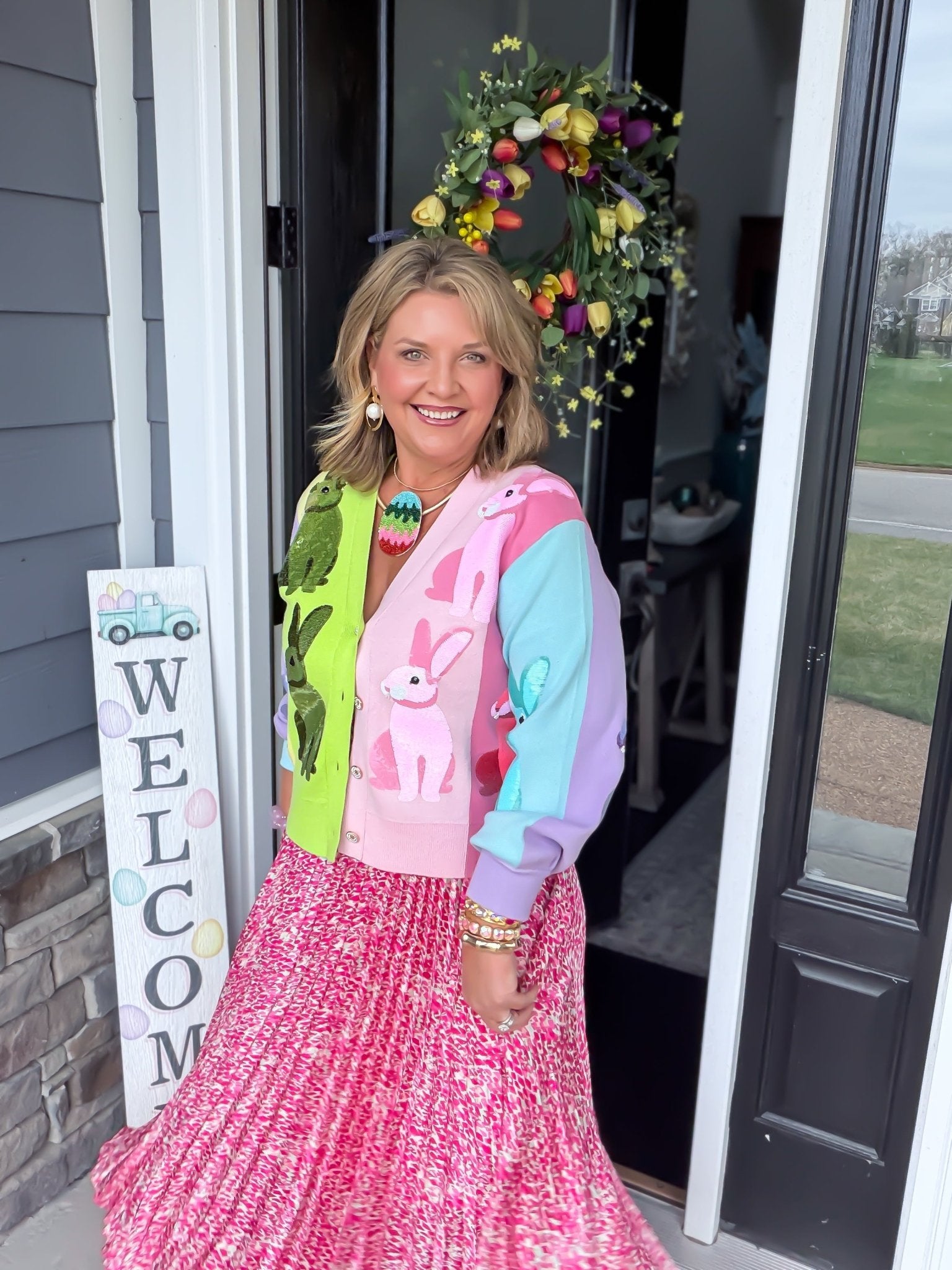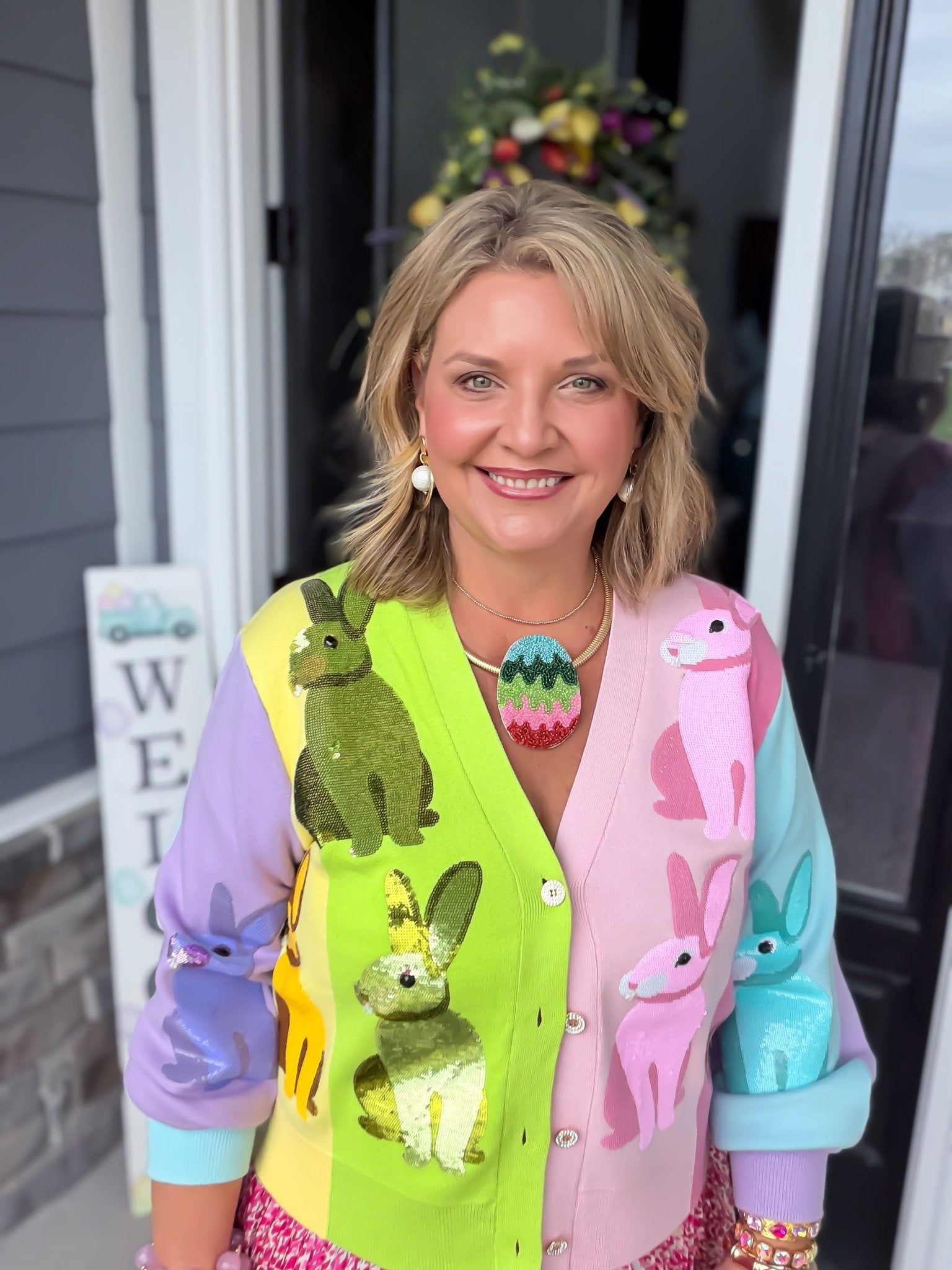 Shine this spring in the Queen Of Sparkles Rainbow Sequin Easter Bunny Cardigan. This vibrant colorblock button-up blends festive luxury with cozy comfort for the ultimate holiday statement. Perfect for making an unforgettable entrance at every Easter brunch and egg hunt.
