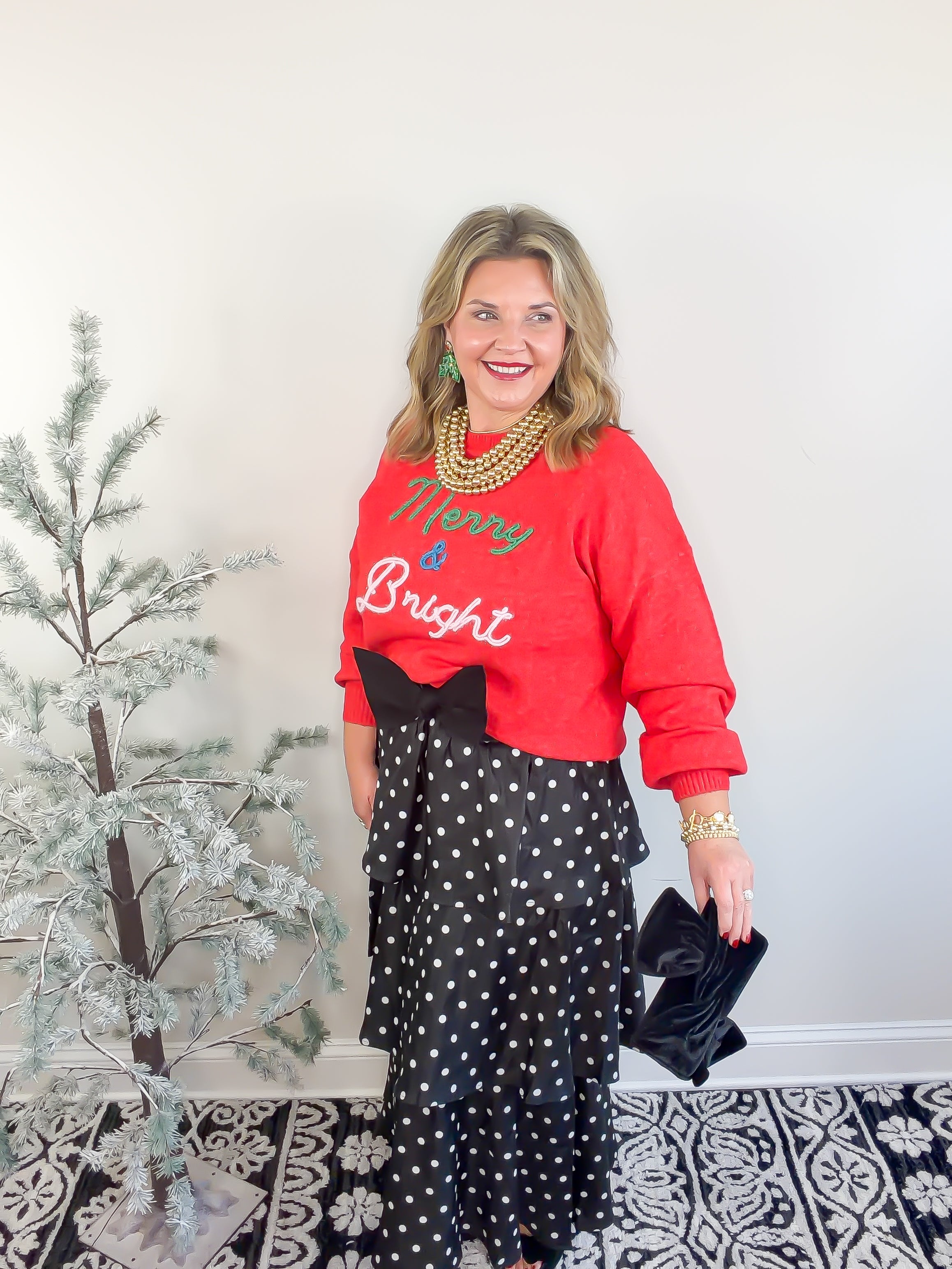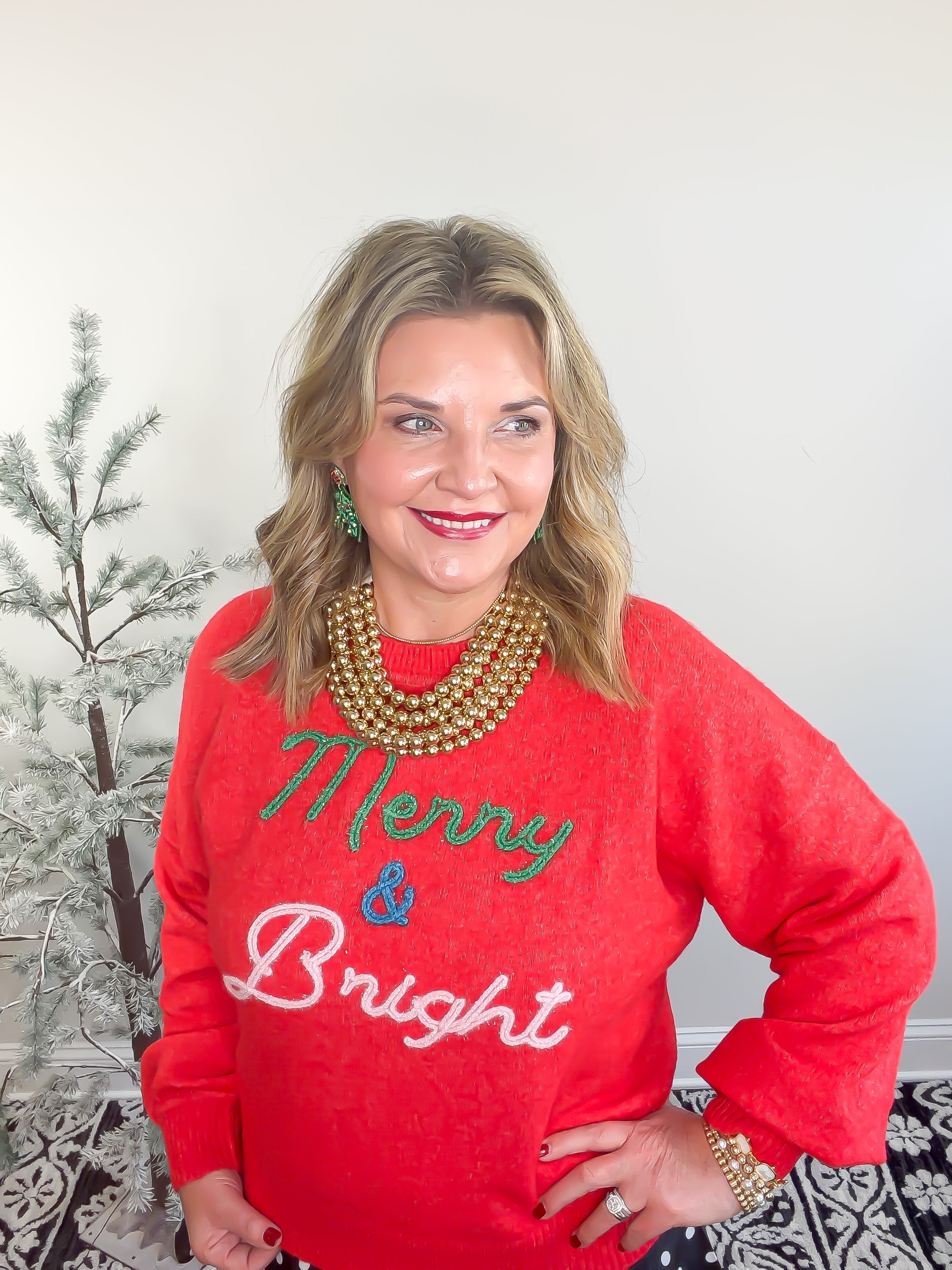 Bring extra joy to your holiday style with the “Merry & Bright” Sweater. This cheerful red pullover showcases lively yarn-embroidered letters in bright green, blue, and white, adding a fun splash of festive color. Crafted for comfort and cozy warmth, it’s the ideal choice for spreading holiday cheer. Whether you're at a cookie exchange or holiday happy hour, this sweater is your go-to for a playful, festive look.