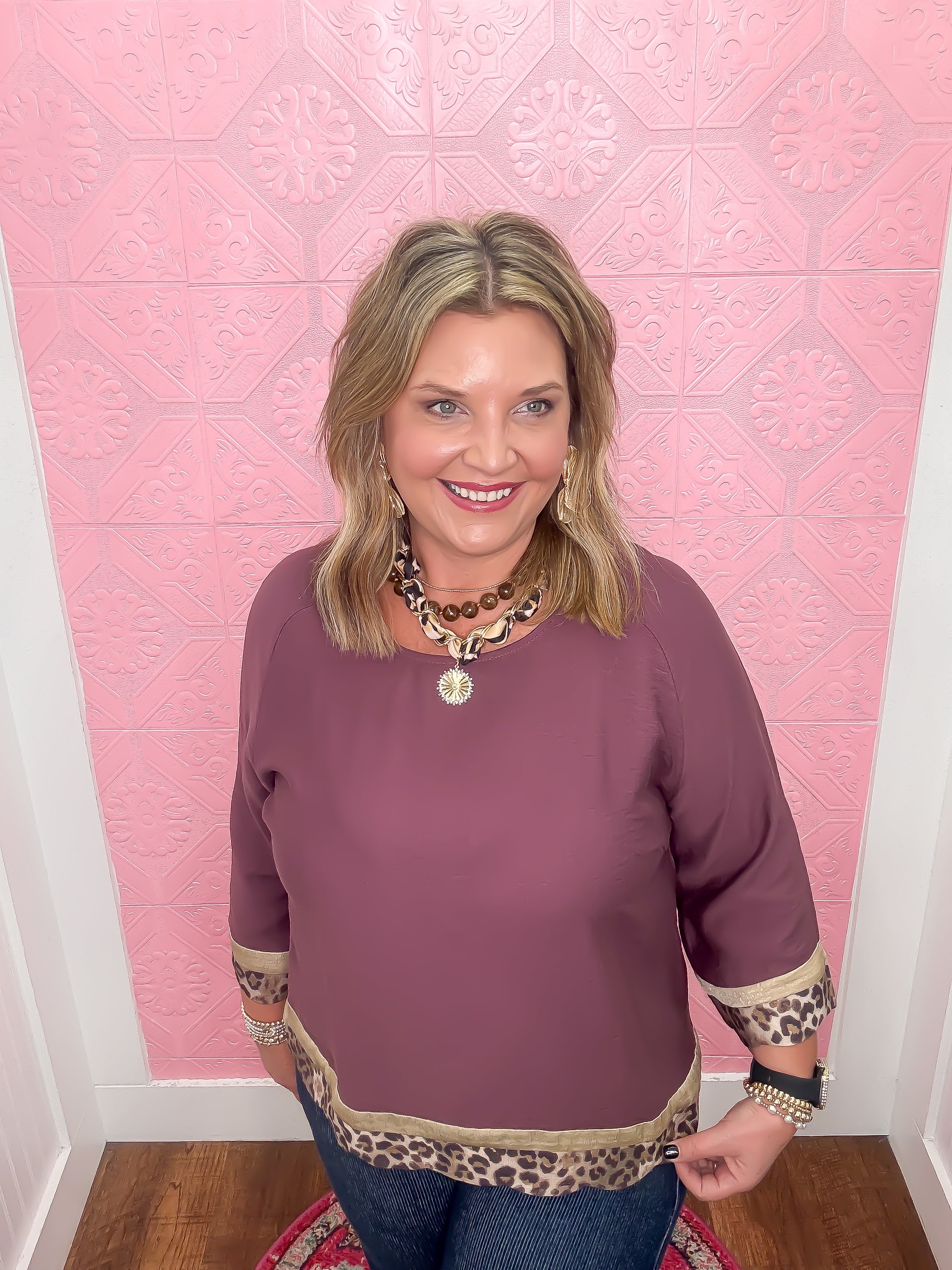 Bring a little wild charm to your wardrobe with the Lowcountry Leopard Blouse. Featuring a playful scalloped leopard print trim and breezy 3/4 wide bell sleeves, this round-neck blouse combines comfort with a fun, flirty edge. Lightweight and unlined for easy wear, it’s perfect for adding a splash of personality to any outfit. Perfect for those who love to stand out without trying too hard!