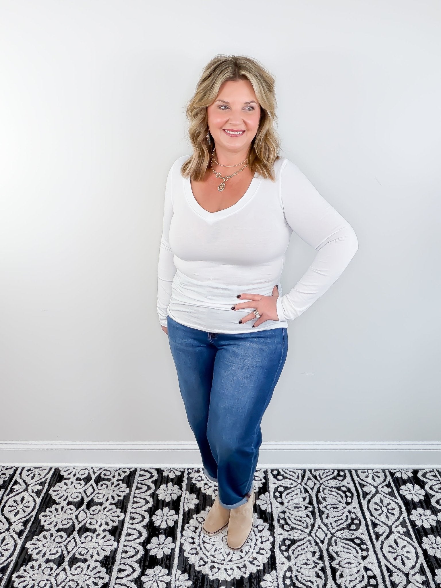 Step into effortless style with The Classic V Top in crisp white. Its V-neck and long sleeves bring a playful twist to a timeless basic, perfect for layering or wearing solo. Soft, comfy, and ready to brighten up any outfit!