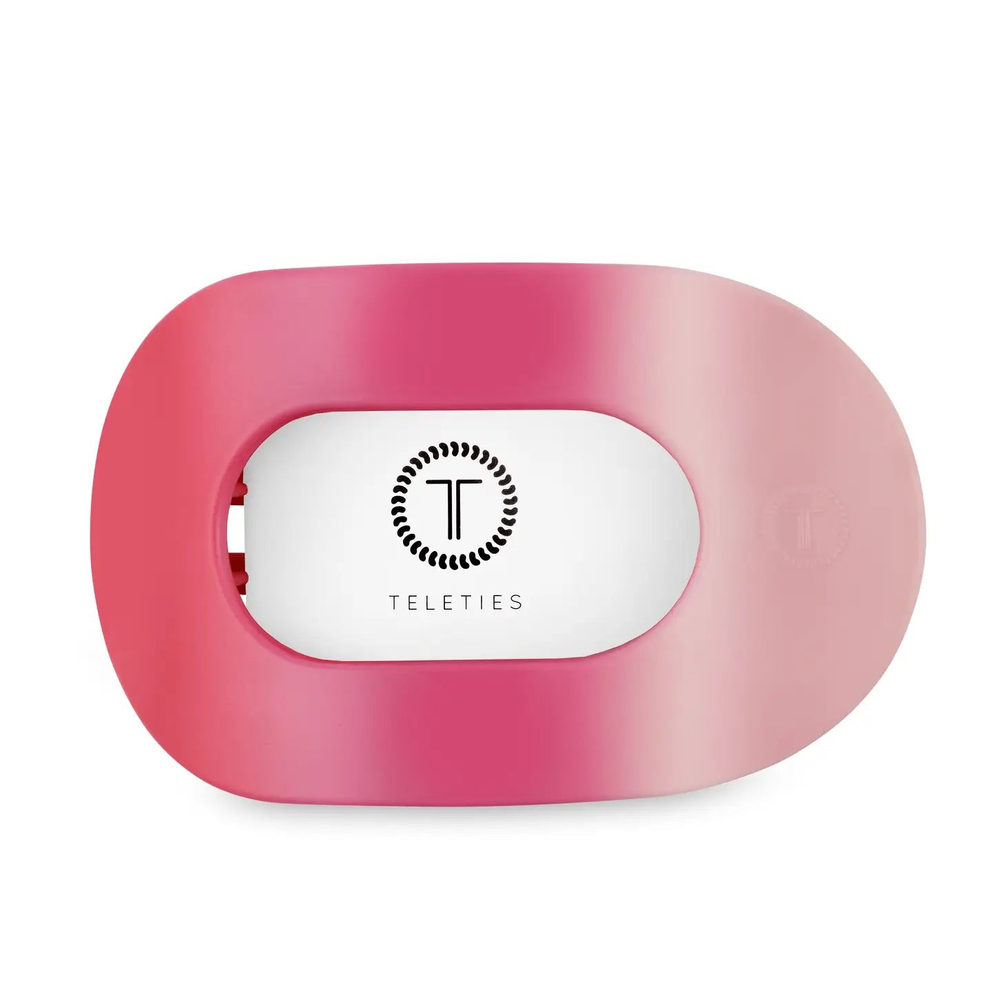 Lay flat and relax with the new TELETIES Kiss & Tell Flat Round Hair Clips in Pink. Hand-sprayed for a one-of-a-kind pink and red ombré—expect slight variations in each clip. This hair clip is designed to allow you to lay back flat, do yoga, or sit comfortably in a seat with a headrest, and it is made with the same material that is nearly unbreakable.