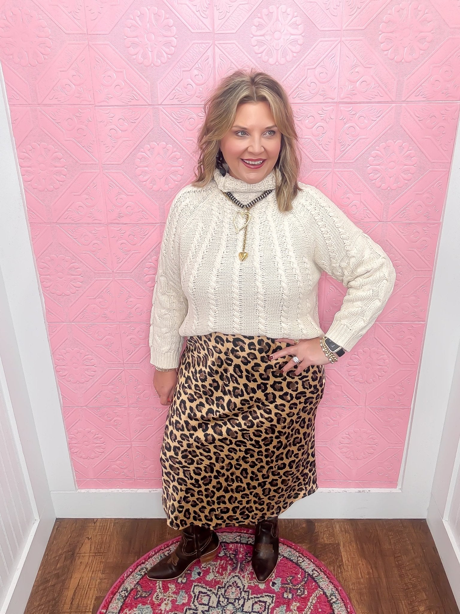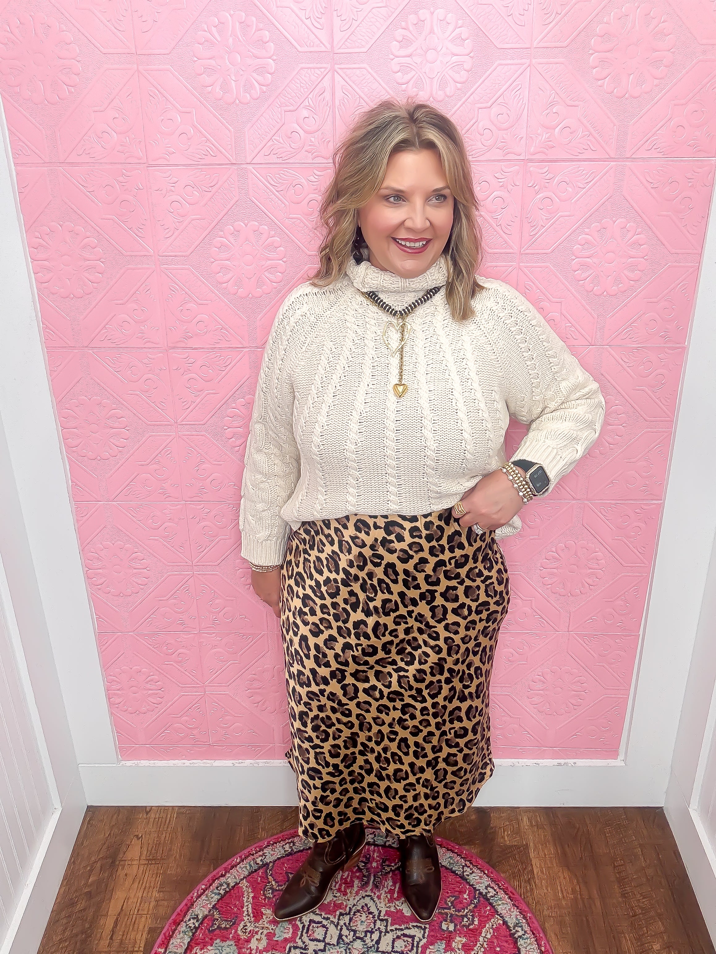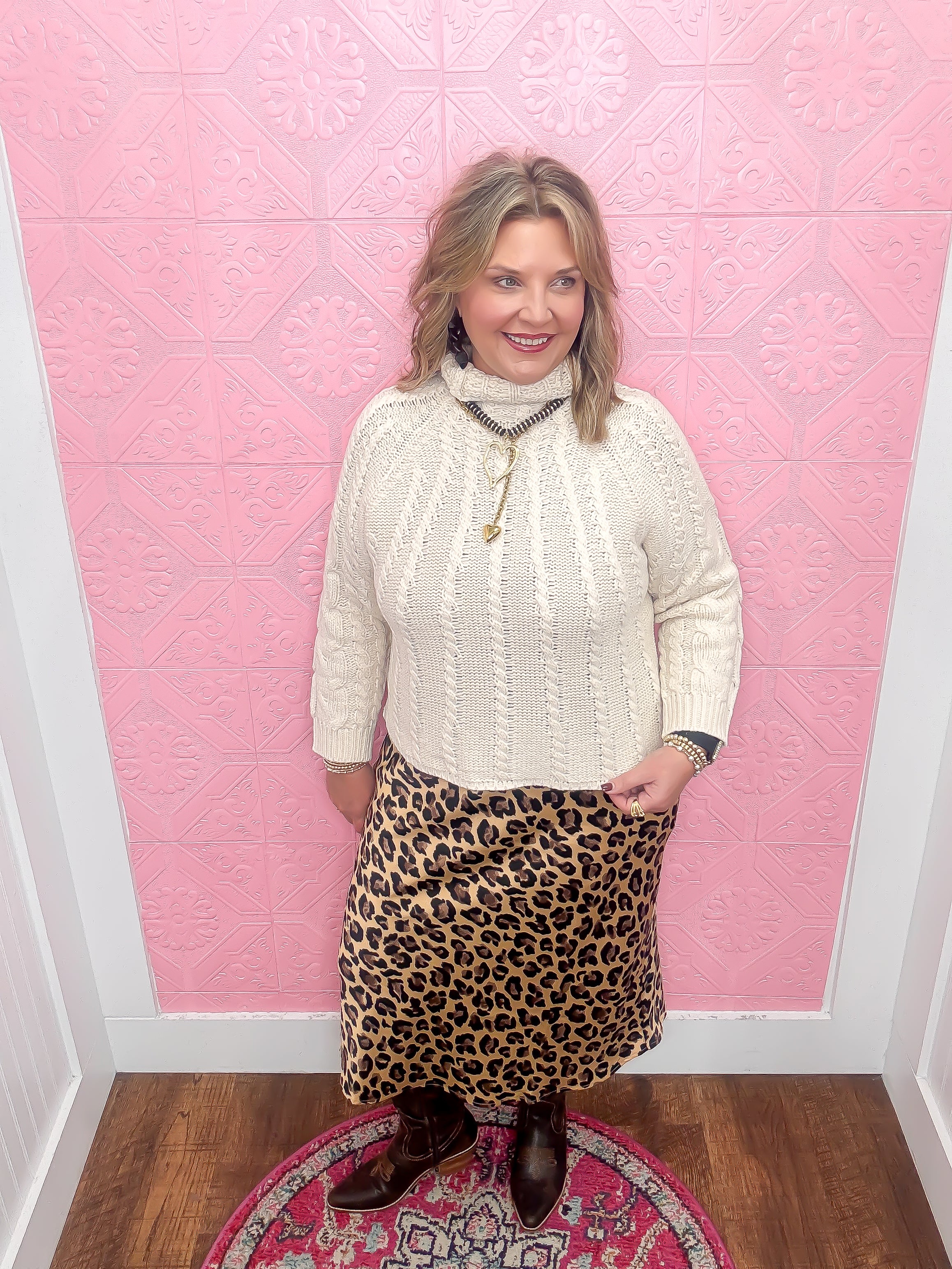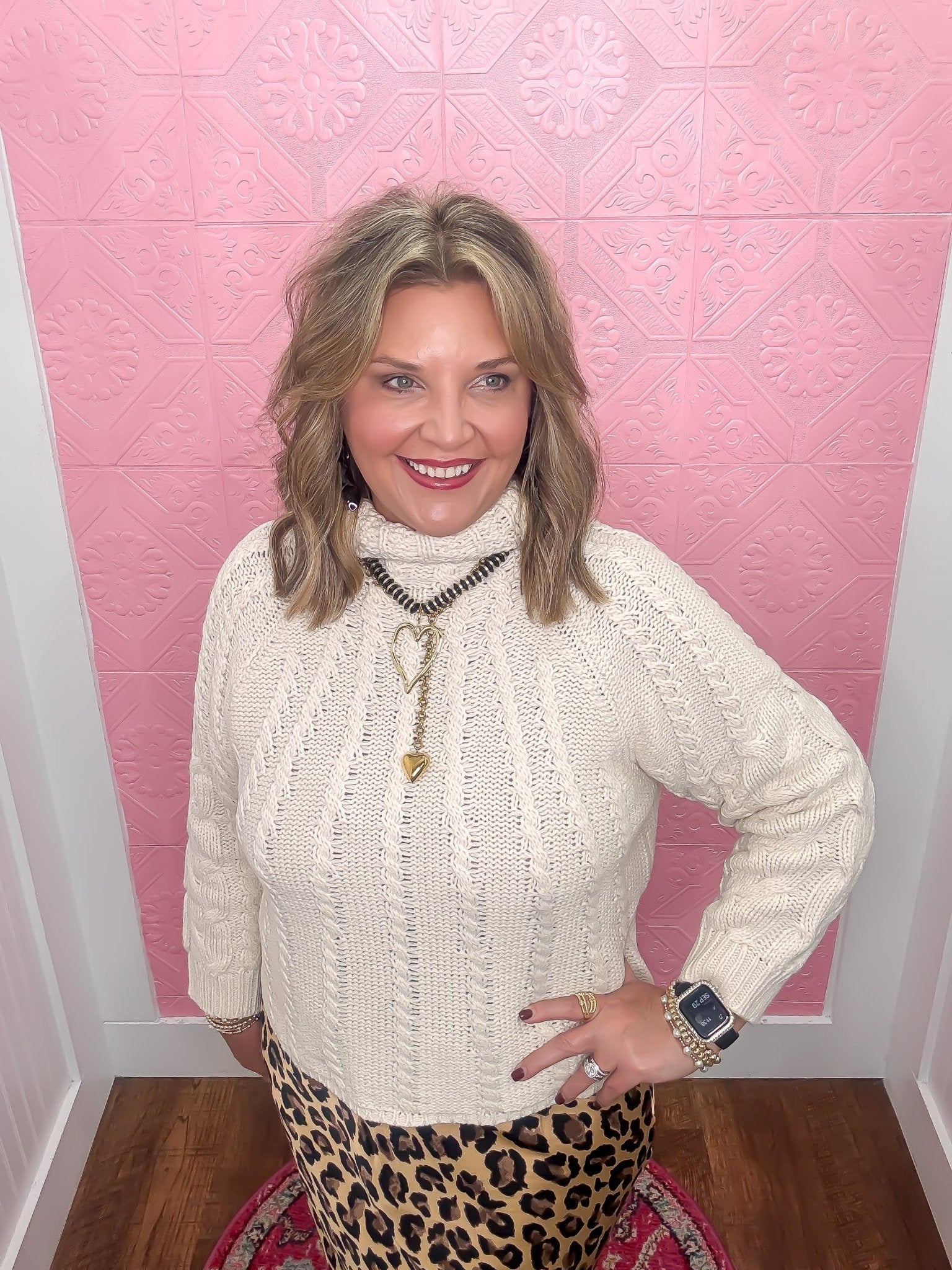 Cozy up with The Winter Luxe Turtleneck Sweater, featuring a charming cable knit texture that’s as fun to touch as it is to wear. Its snug turtleneck keeps you warm without sacrificing style, making it perfect for chilly days when you want to stay comfy and chic. Pair it with your favorite jeans or leggings for an effortlessly playful winter look.