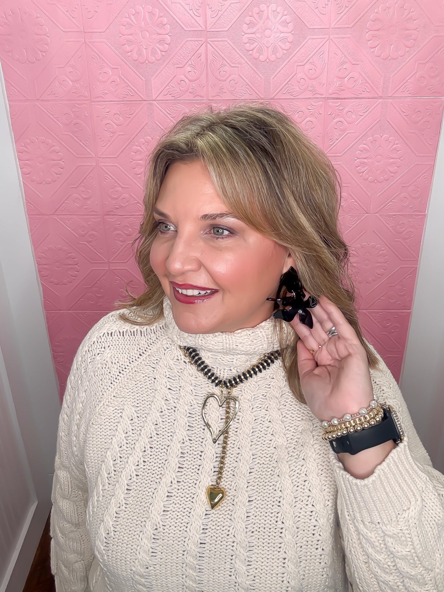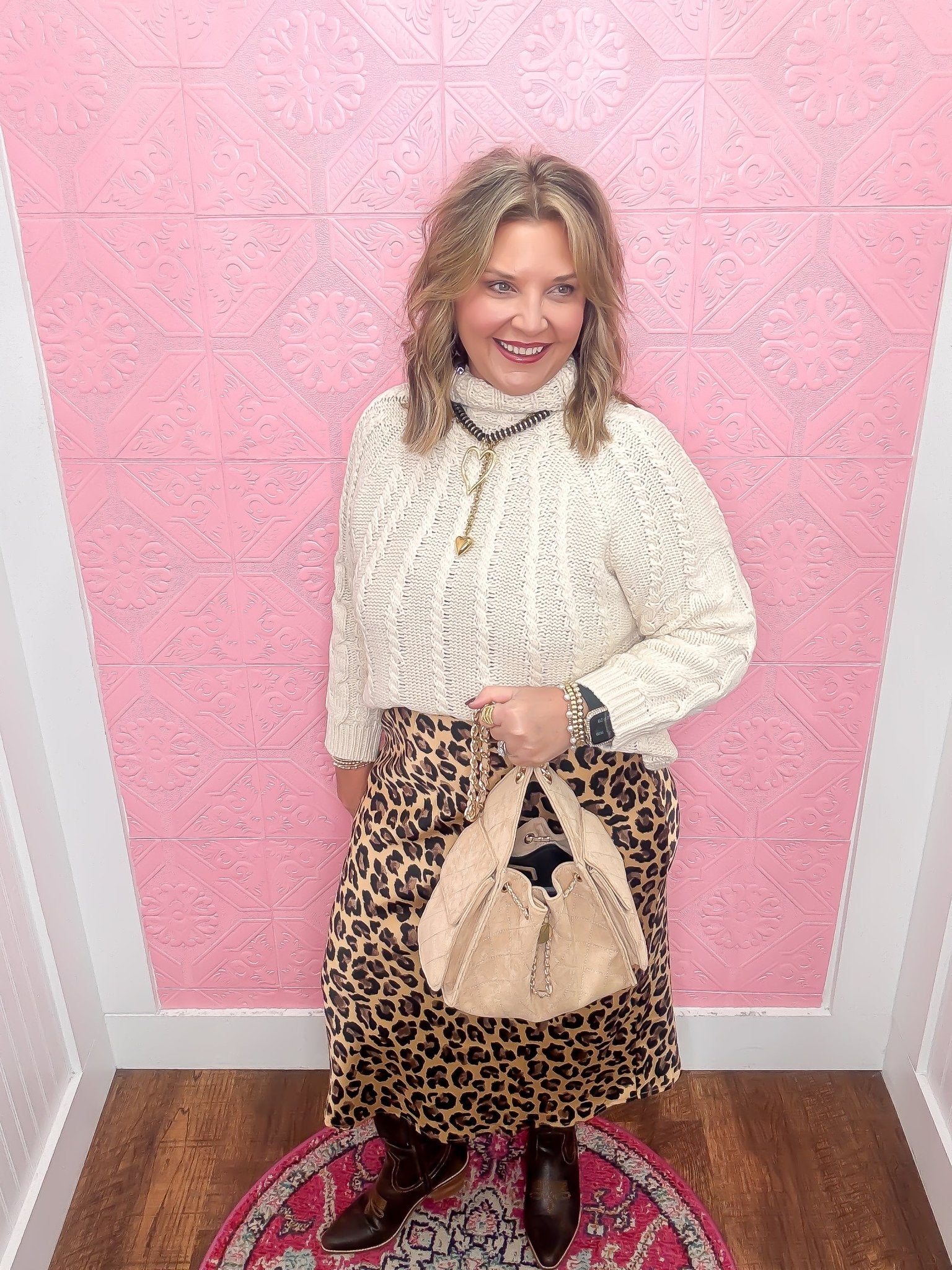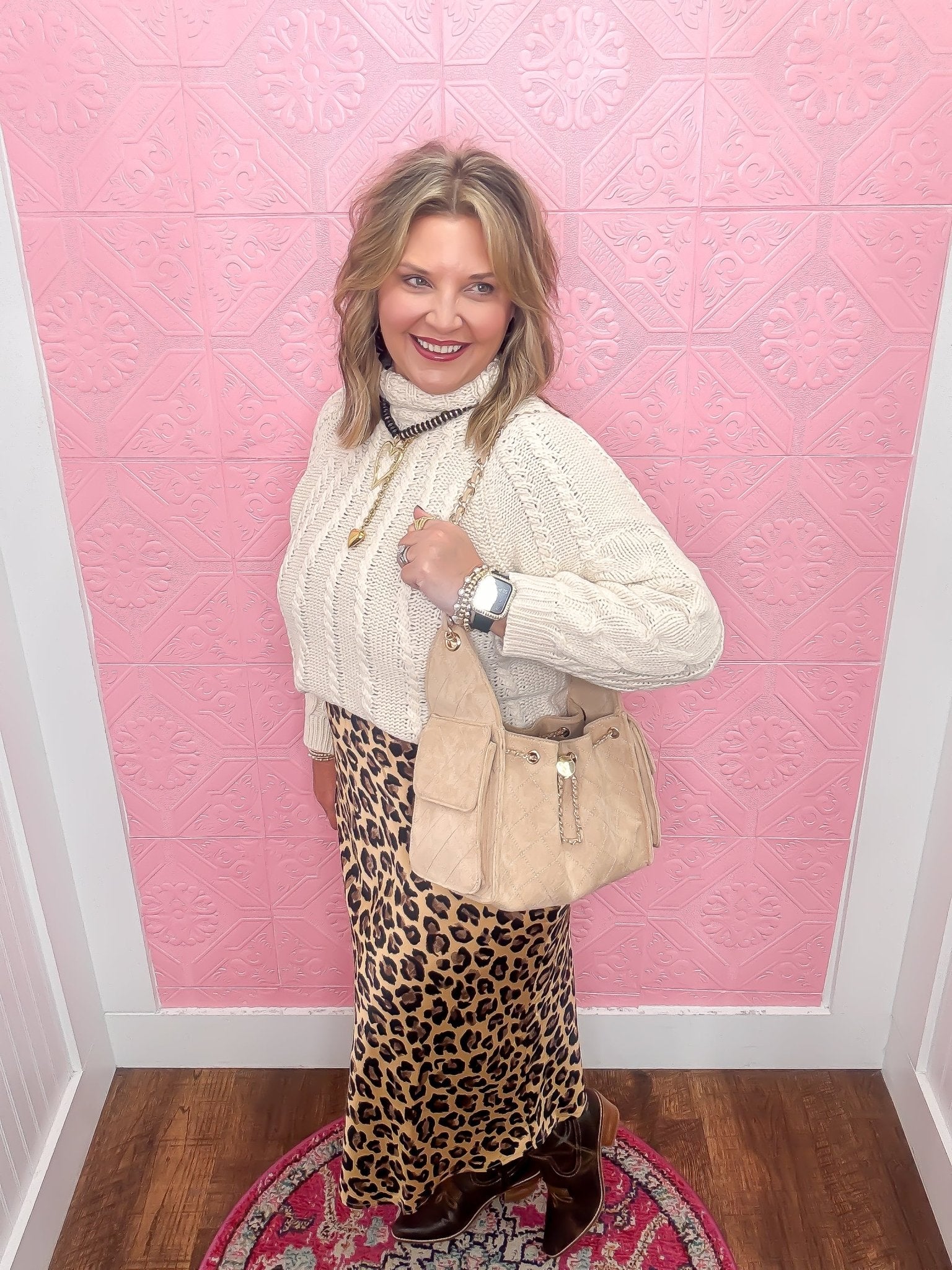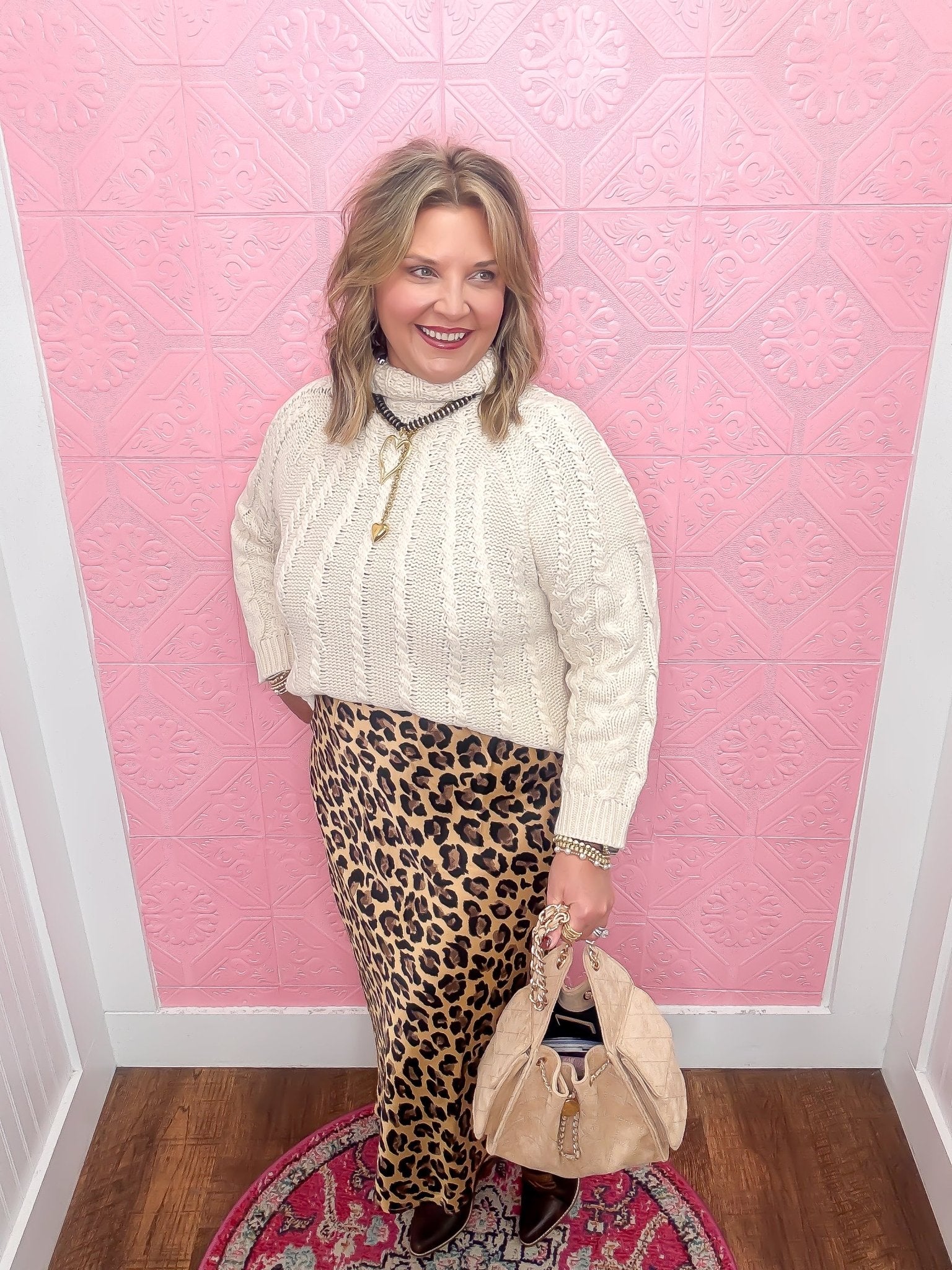 Cozy up with The Winter Luxe Turtleneck Sweater, featuring a charming cable knit texture that’s as fun to touch as it is to wear. Its snug turtleneck keeps you warm without sacrificing style, making it perfect for chilly days when you want to stay comfy and chic. Pair it with your favorite jeans or leggings for an effortlessly playful winter look.