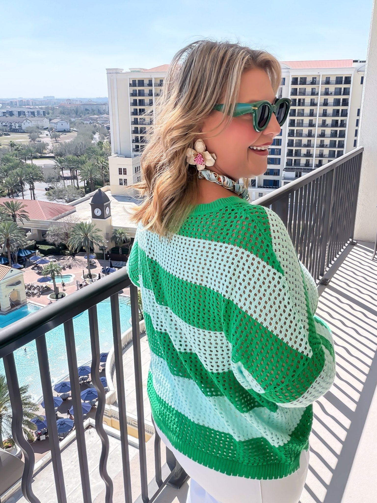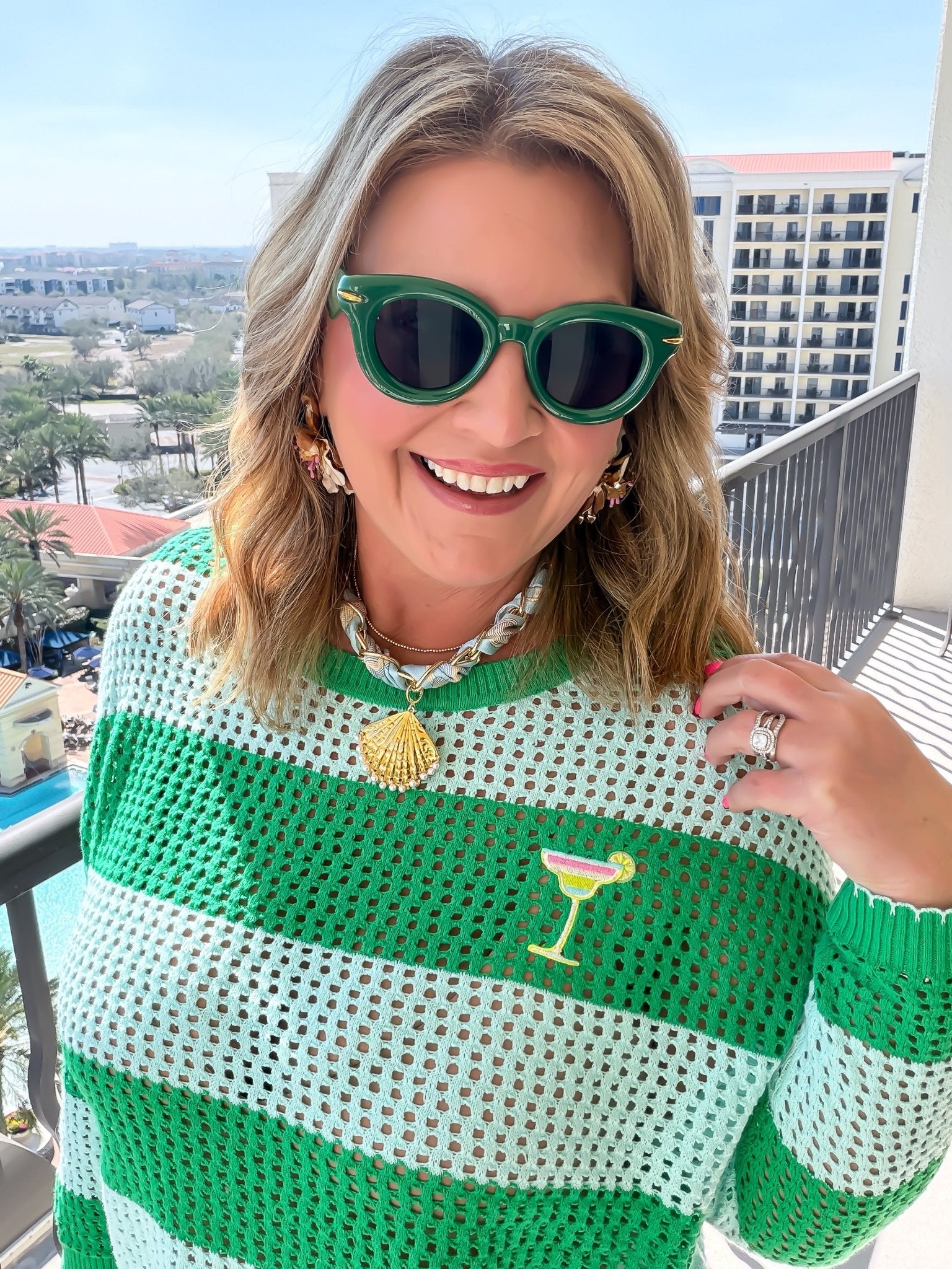 Sip back and relax in the ultimate vacation layer. The Shiraleah Margarita Striped Mesh Sweater combines a lightweight, breathable open-weave knit with a playful, embroidered cocktail detail. Crafted from a premium cotton-acrylic blend, this vibrant green striped sweater is designed for beachside brunches, sunset happy hours, and effortless summer styling. It’s more than a top—it’s your new favorite "happy hour" essential.