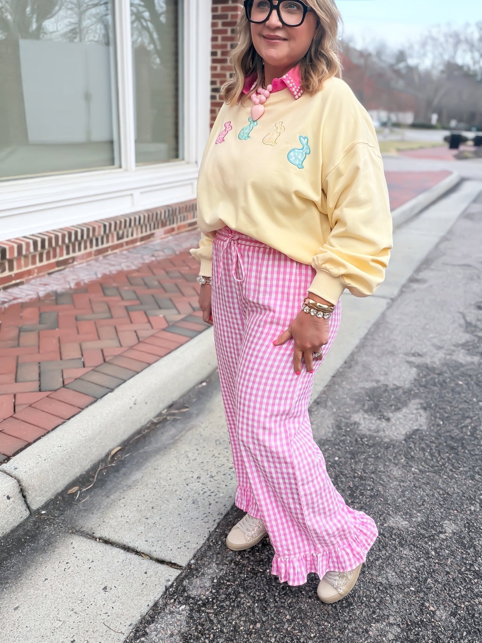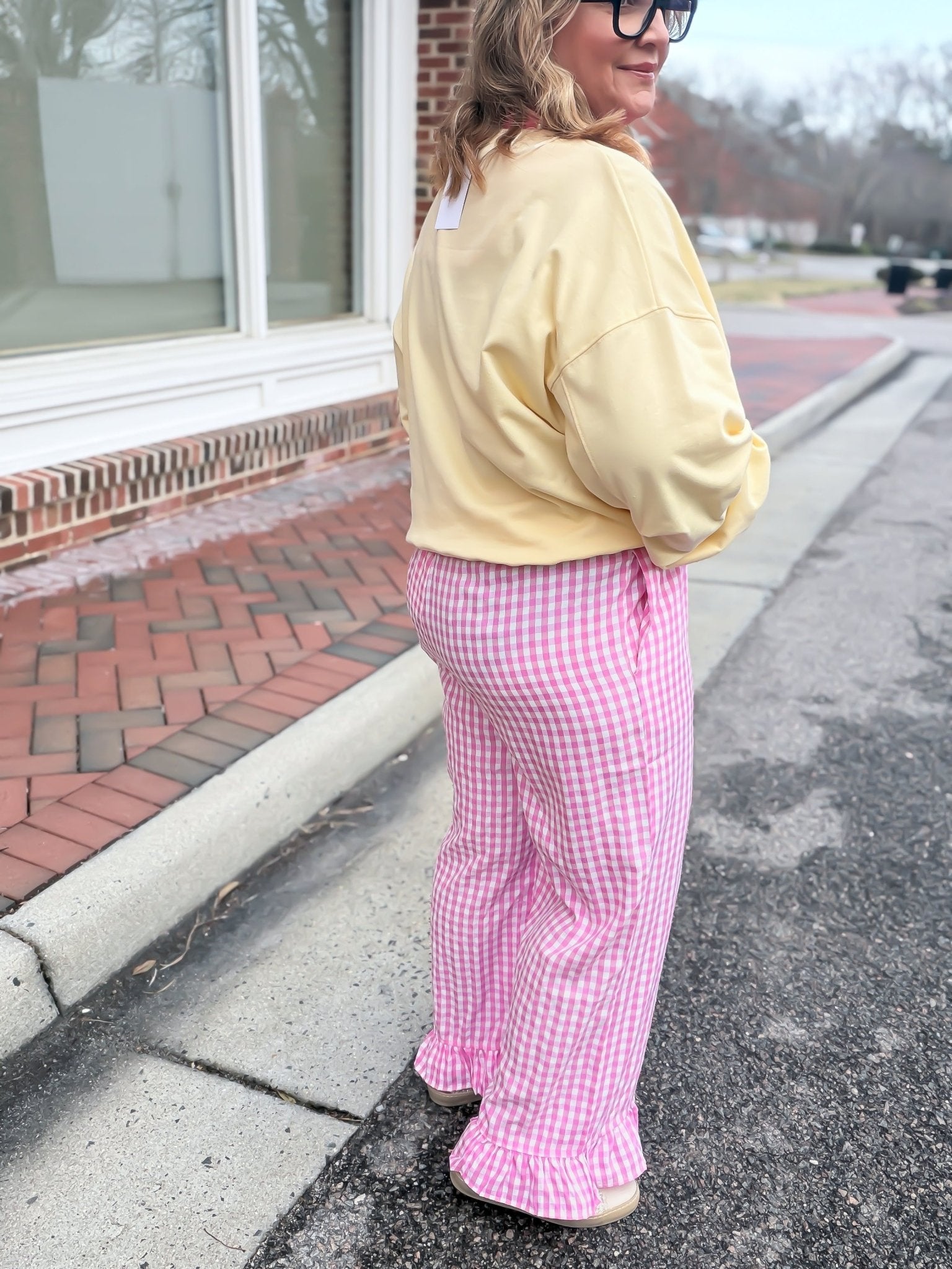 Embrace effortless sunshine style with these breezy pink gingham pants featuring a playful ruffle hem. Designed with a flexible stretch waist and functional side pockets, they offer the perfect blend of comfort and feminine charm. Perfect for picnics, beach strolls, or chic weekend lounging.