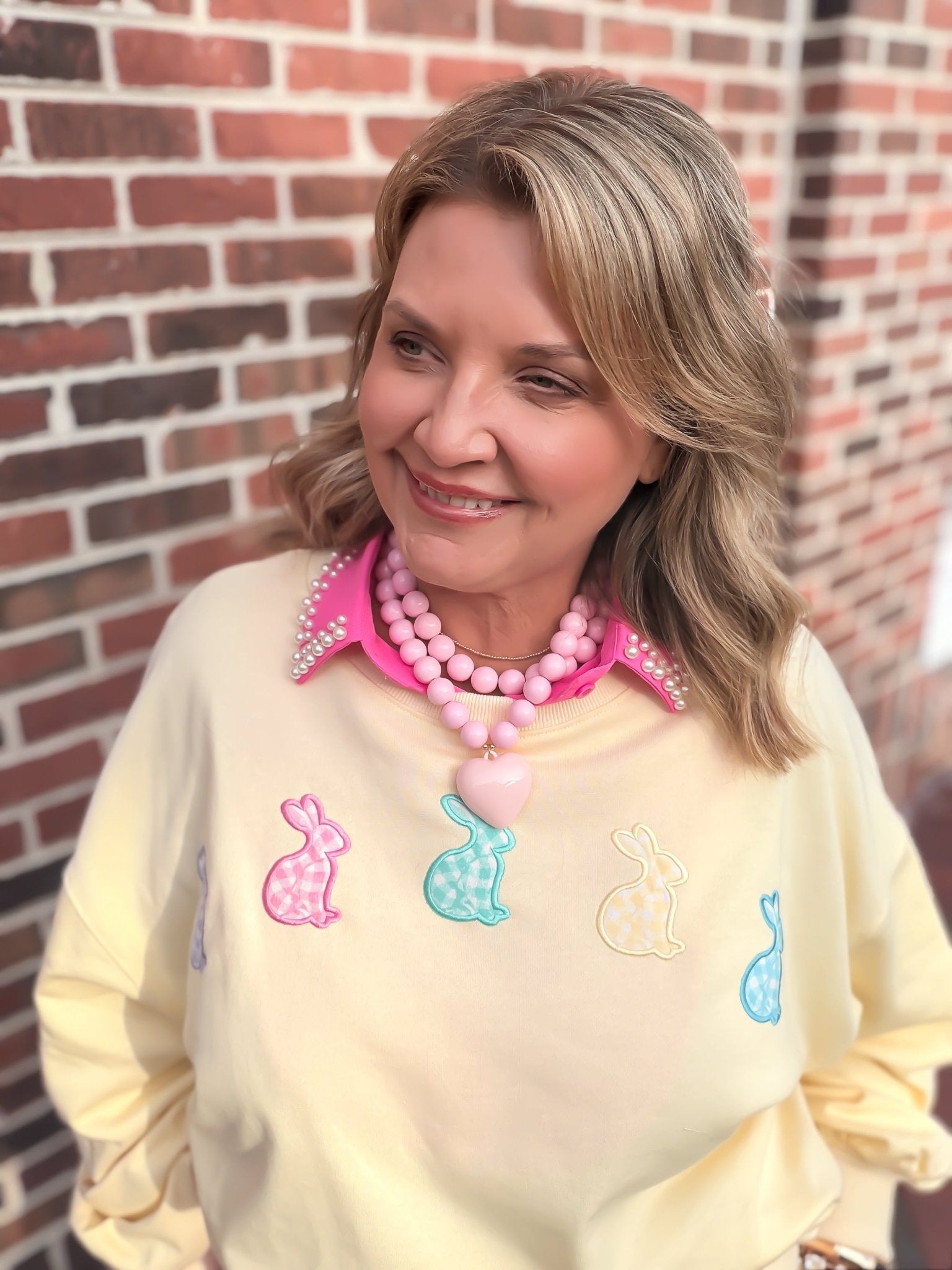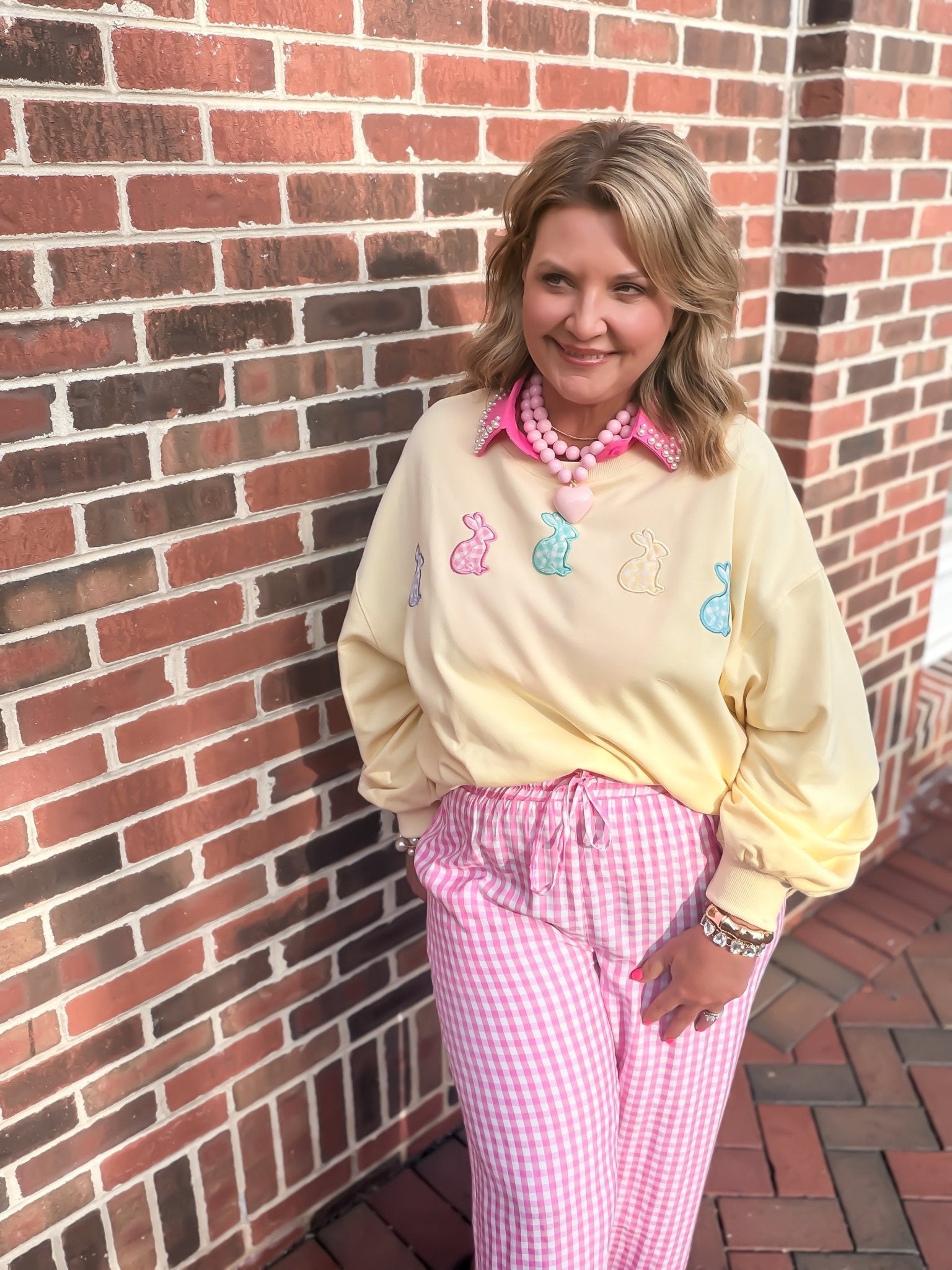 - Whimsical Gingham Patches: Adorned with colorful gingham bunny appliqués, this sweatshirt brings a playful, "Bunny Patch Club" charm to your spring wardrobe.