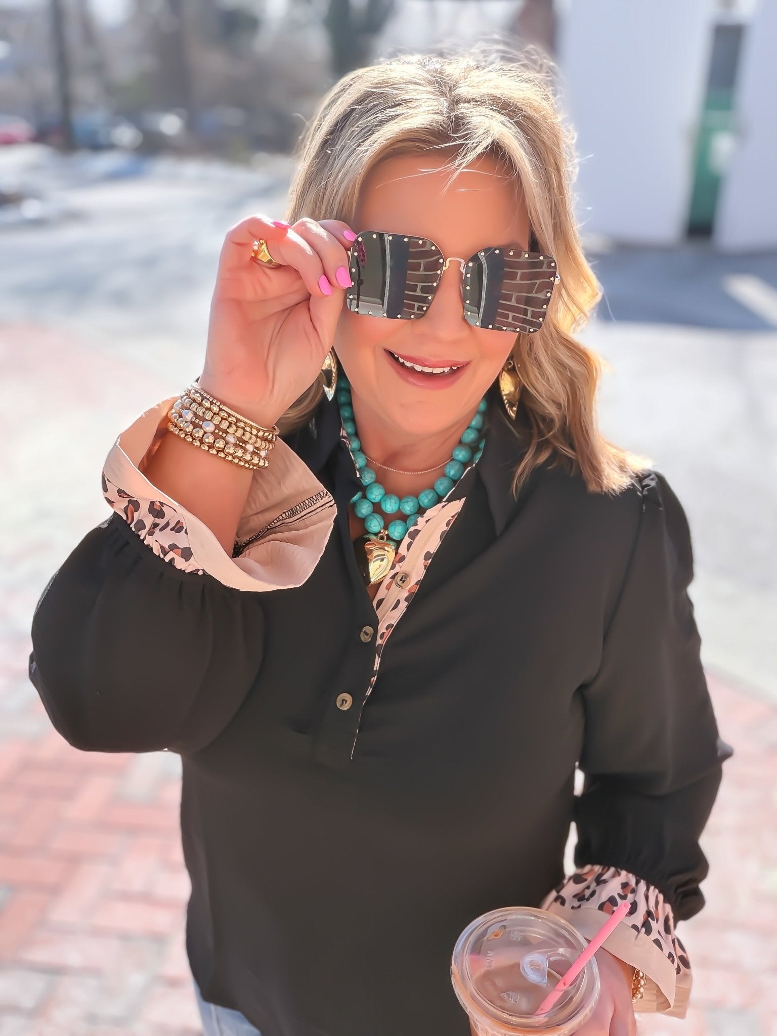 Elevate your everyday style with this The Wild Touch Blouse featuring eye-catching leopard trim details. The sleek black base pairs perfectly with the bold animal print accents, creating a look that's both sophisticated and fun. Crafted for comfort and versatility, this top transitions effortlessly from casual outings to night-out moments. Available in sizes S-XL, it's the perfect piece to add a touch of wild flair to your wardrobe without going overboard.