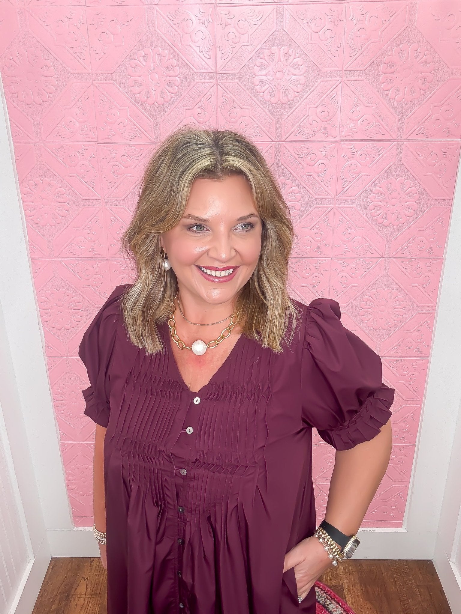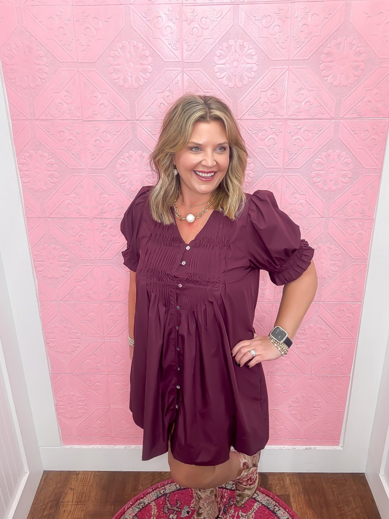 The Refined in Merlot Mini Dress delights with its playful short puff sleeves and a diamond smocked band that adds a touch of charm. Its pintuck details and V-neck button closure create a flirty finish, while side pockets keep it casual and convenient. Lightweight, fully lined, and woven with care, this non-sheer dress is perfect for twirling through any sunny day or evening out.