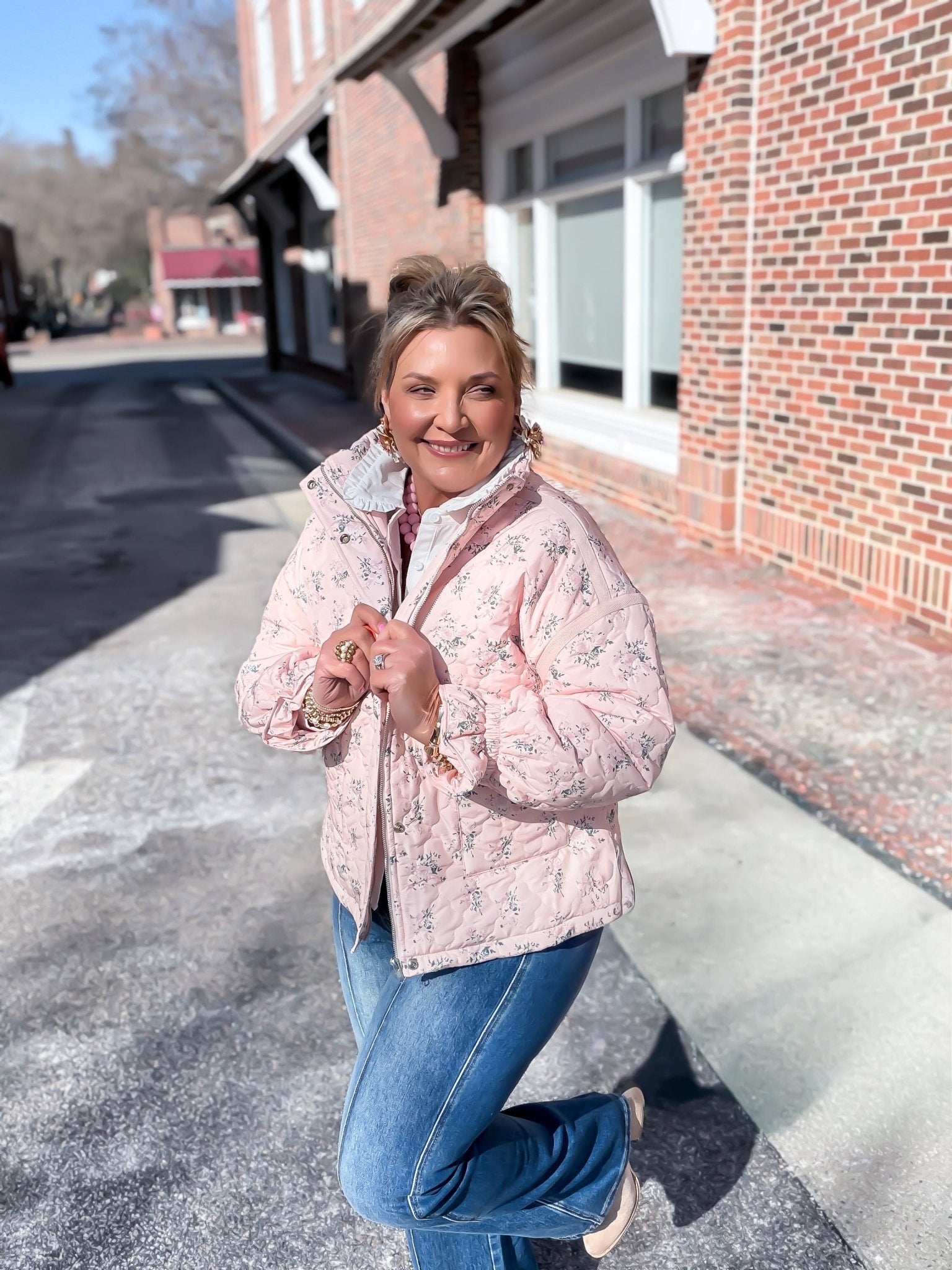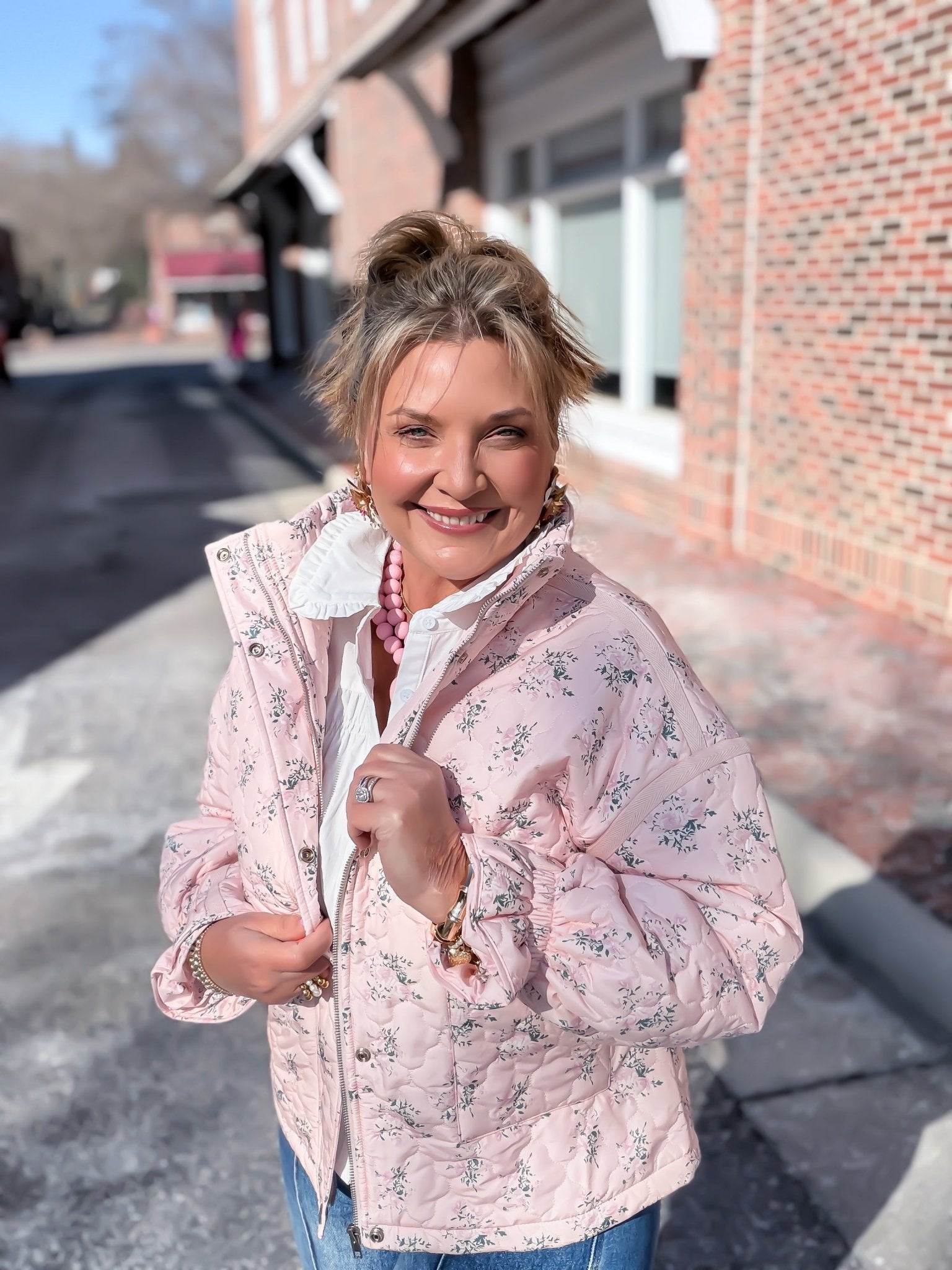 Embrace your softer side with this Blush Garden Quilted Jacket. Adorned with delicate floral patterns, it's the perfect blend of pretty and practical. The quilted construction keeps you toasty without the bulk, while the relaxed oversized silhouette makes layering a breeze. Slip your hands into the convenient side pockets and button up for an instantly polished look. Whether you're running errands, jet-setting, or just vibing in cozy-chic style, this lightweight wonder has you covered for those crisp-air moments.