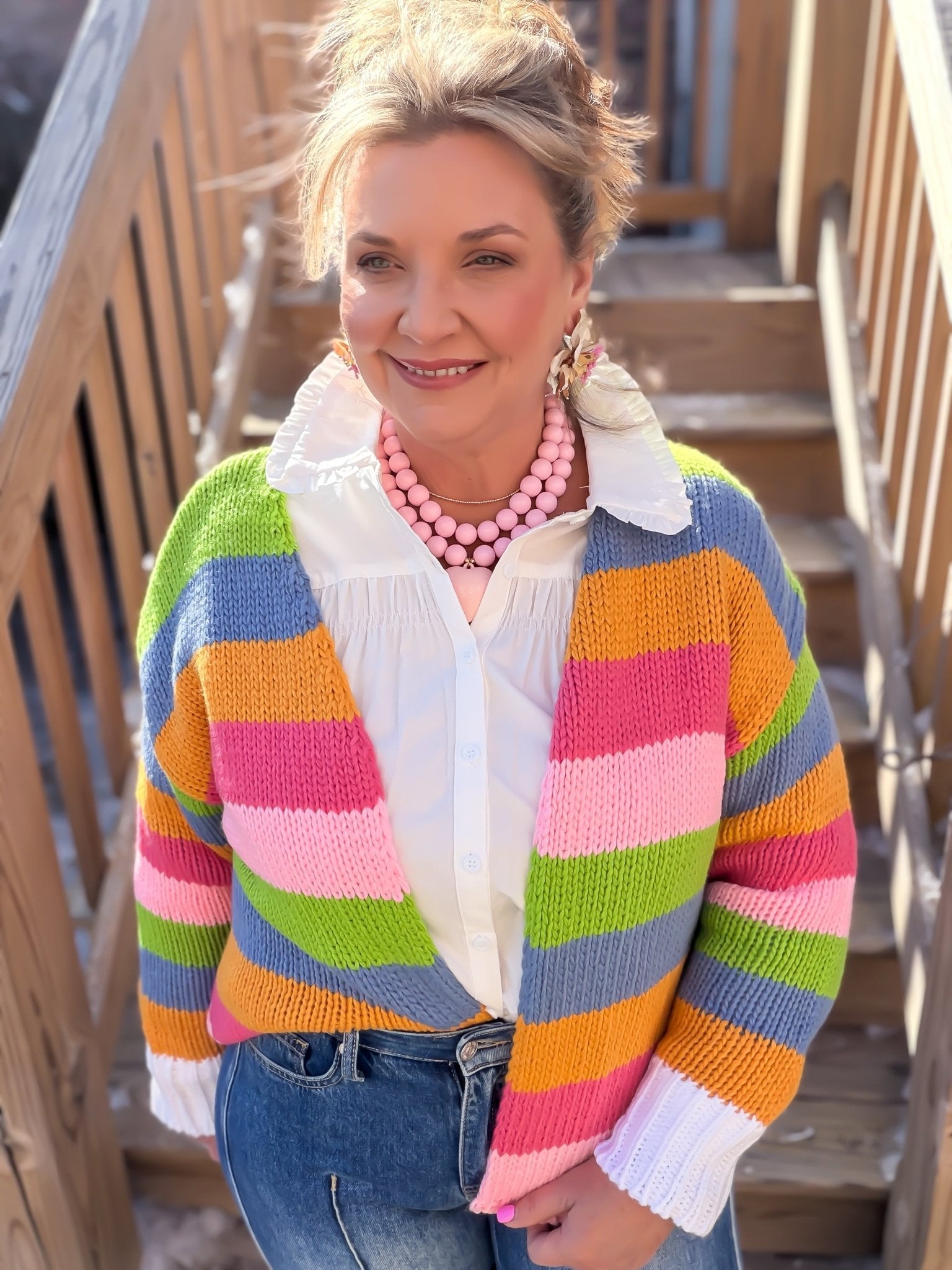 Layer up with personality in this vibrant Bright Side striped cardigan that brings instant cheer to any outfit. Bold, chunky knit construction keeps you cozy while the multicolored stripes add a fun pop of color that works with everything from jeans to dresses. Perfect for those days when you need a little extra warmth and a whole lot of style.